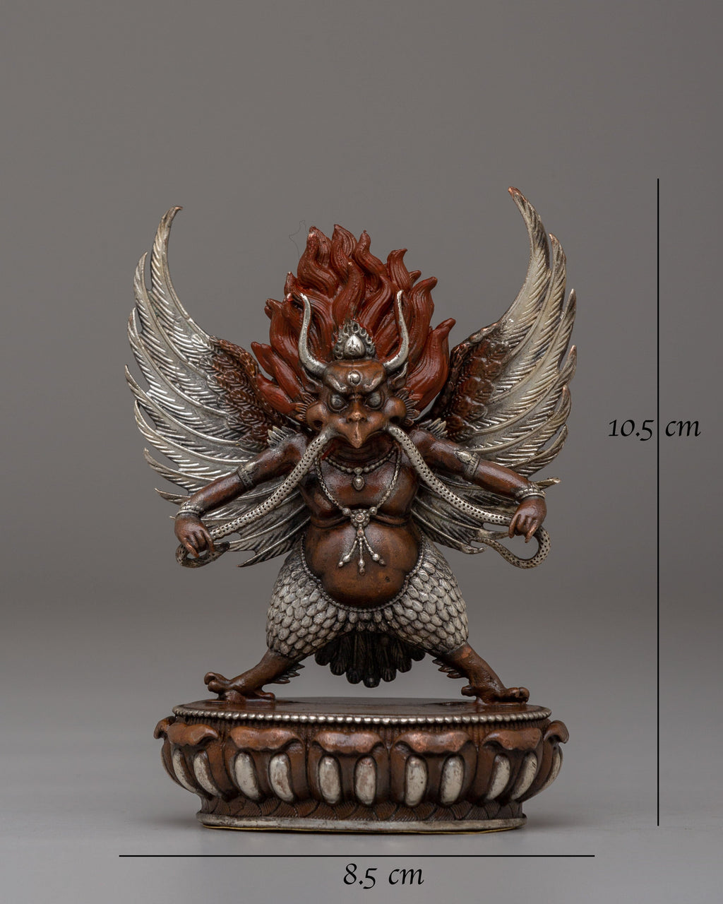 The Buddhist Garuda Handcrafted Statue is a stunning work of spiritual art, meticulously crafted from oxidized copper and enhanced with electro-silver plating. Standing 10.5 cm tall and 8.5 cm wide, this statue captures the majestic presence of Garuda, the revered bird deity in Tibetan Buddhism known for strength, protection, and swift action against negative energies. Weighing 0.25 kg, it offers both stability and a balanced feel, making it perfect for placement on altars, meditation spaces, or other sacred areas of your home.