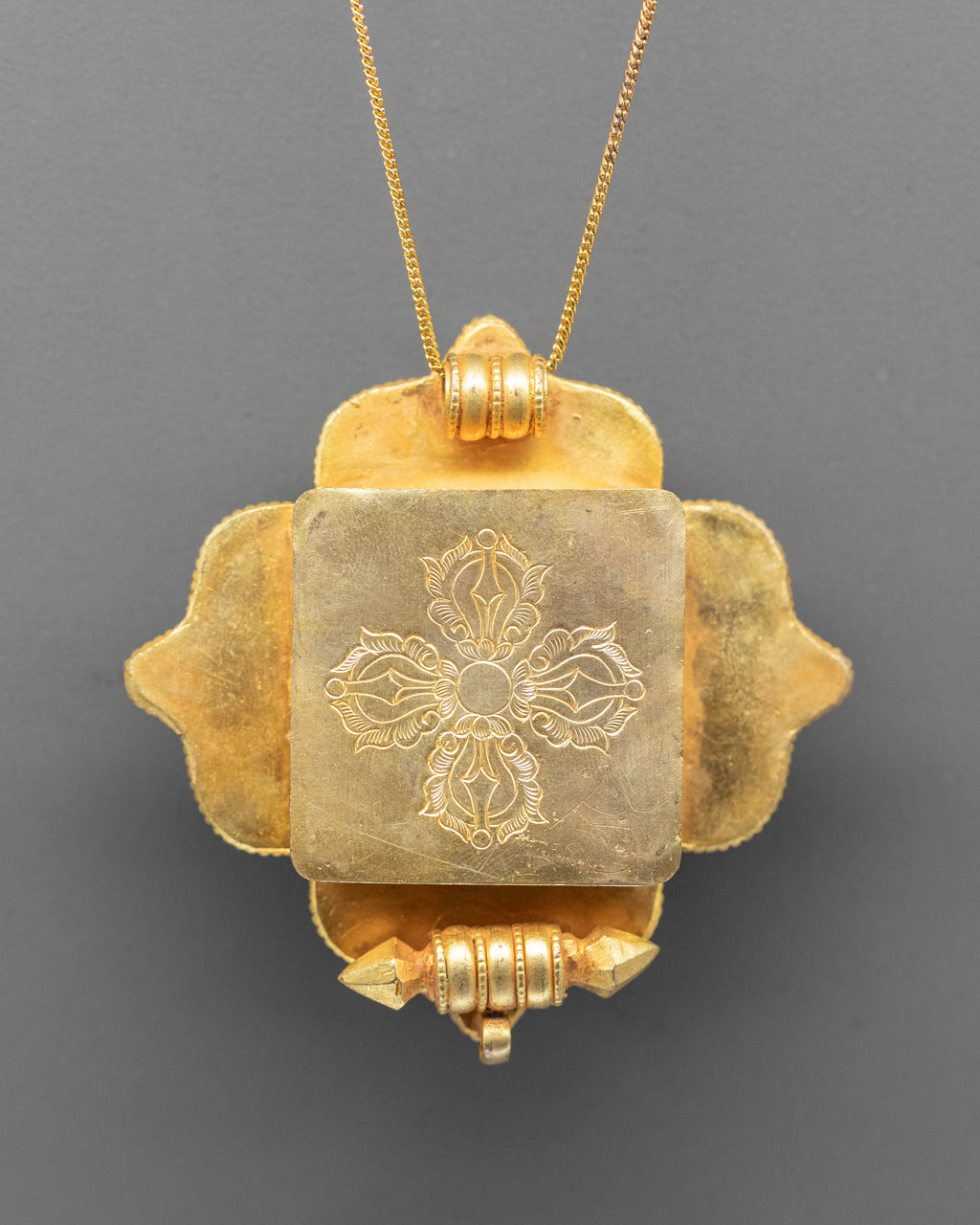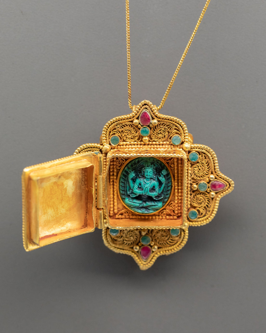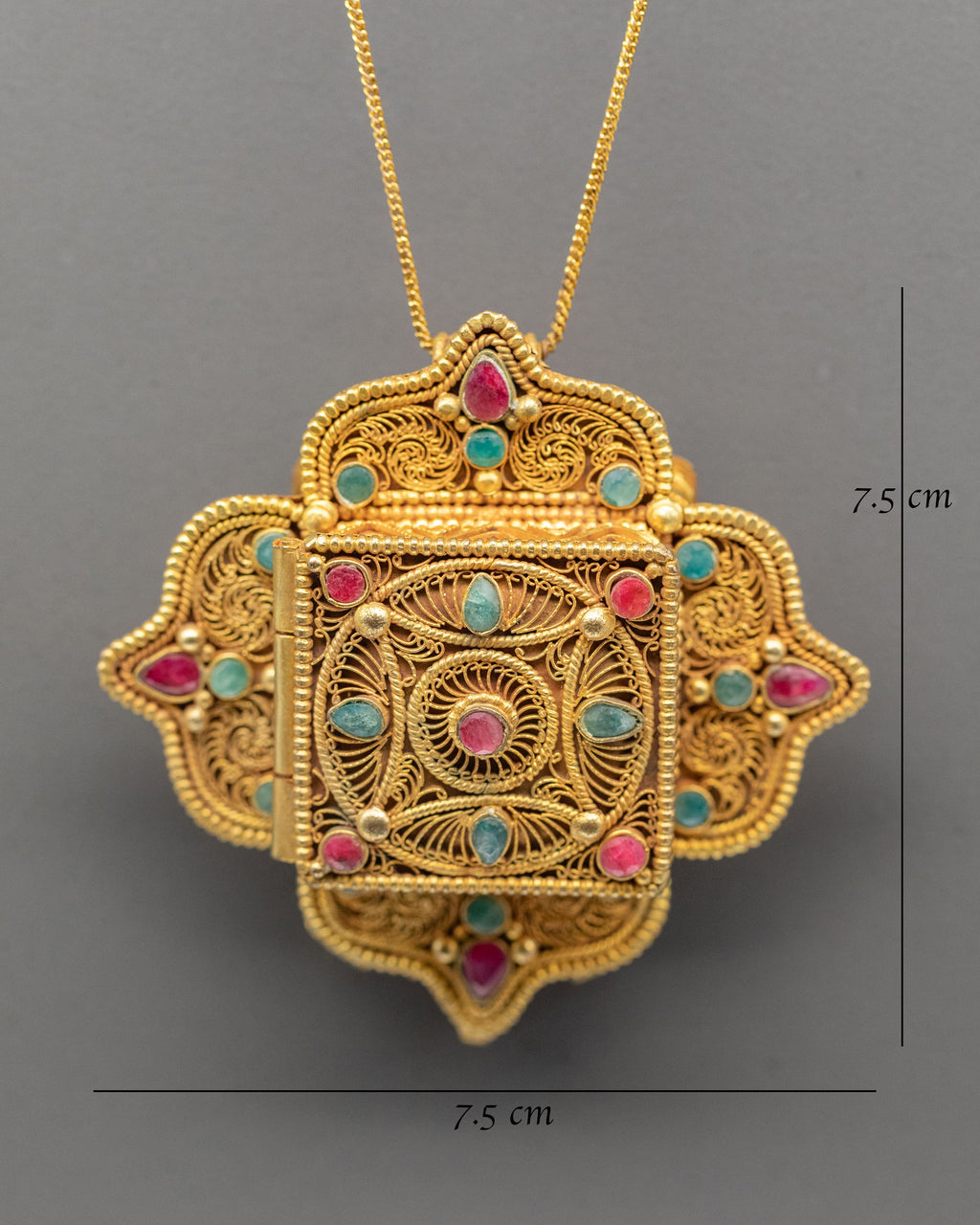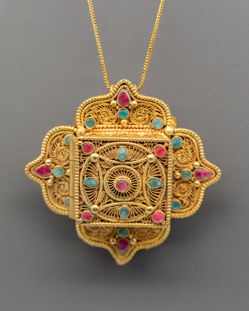The locket follows a classic Tibetan ghau box design, a form long associated with spiritual protection and devotion. The rich ruby and emerald stones symbolize energy, wisdom, and compassion, while the gold-plated accents emphasize intricate Himalayan work. The symmetrical layout and the design reflect Buddhist craftsmanship influenced by traditional monastery jewelry and ritual objects.