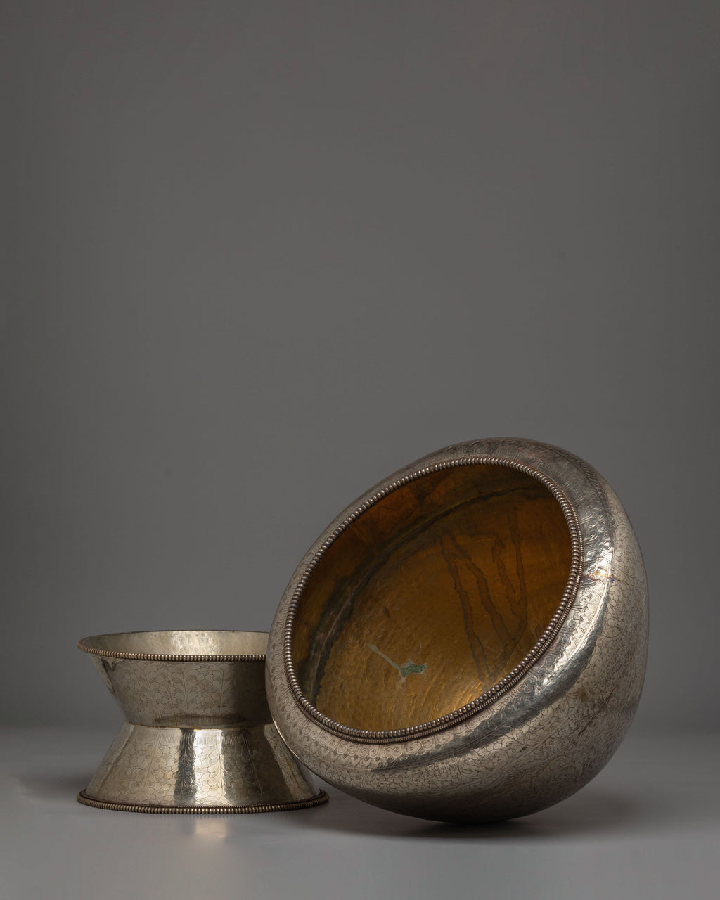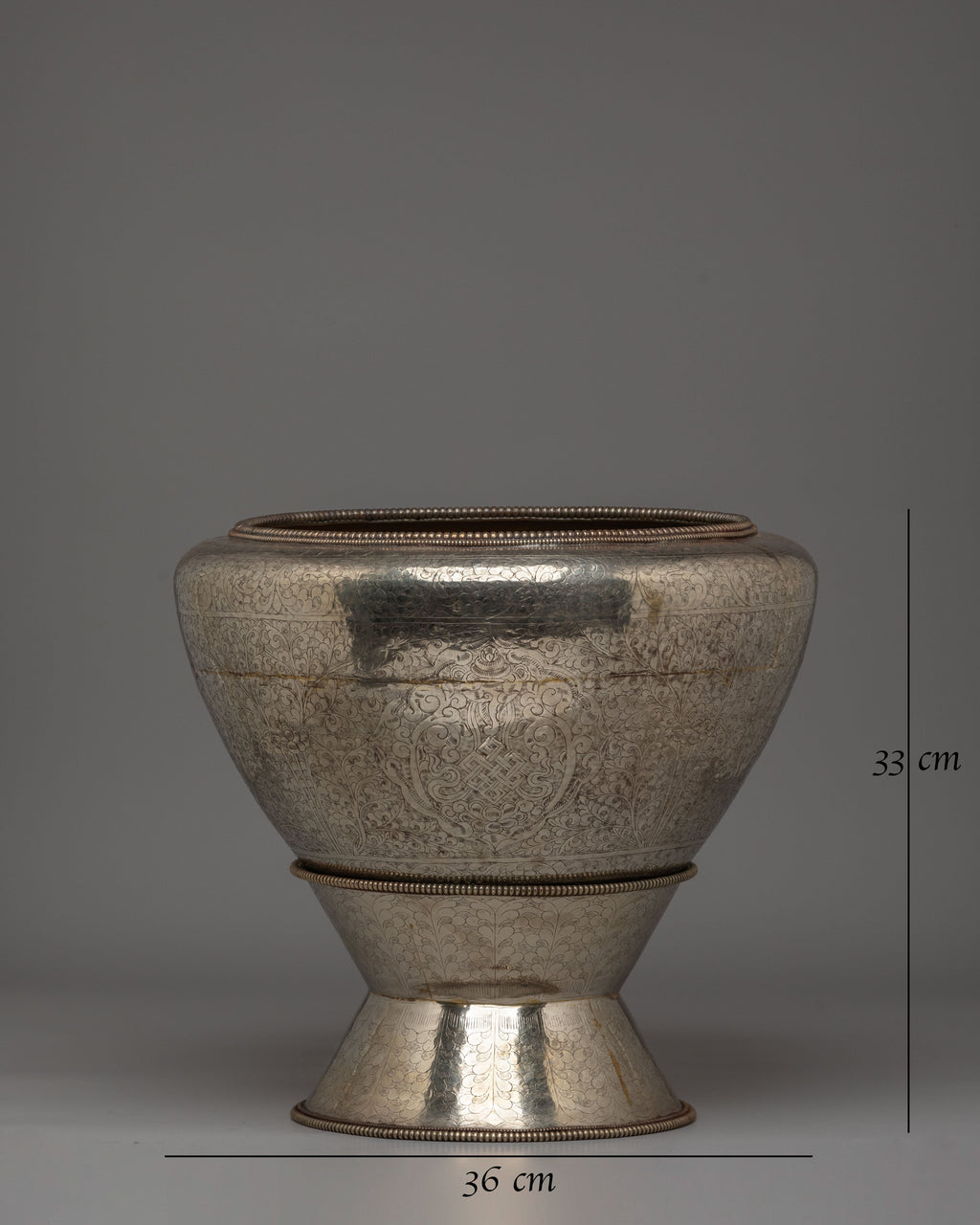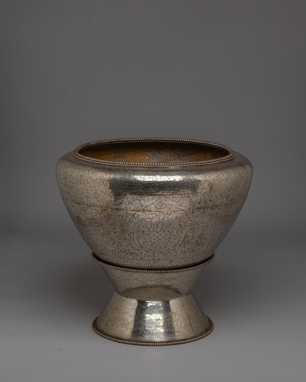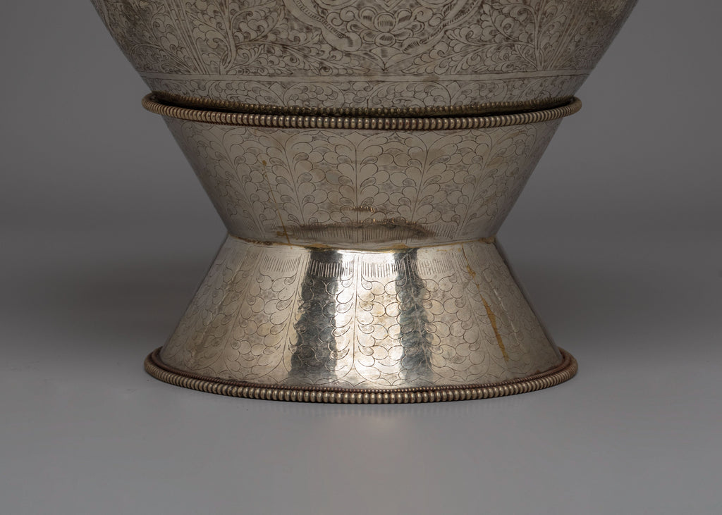 The design of the Golpa features intricate floral patterns that symbolize purity and spiritual enlightenment. The delicate engravings showcase the artistry and skill that went into creating this piece, while the white metal finish gives it a refined and classic look. It is a perfect piece for those who value Buddhist symbolism and wish to bring an aura of peace and spirituality into their lives.