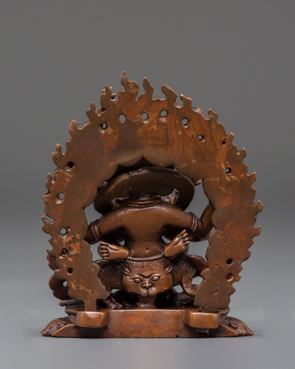 In Tibetan Buddhism, Mahakala is seen as the wrathful protector of dharma and a manifestation of Avalokiteshvara, the Bodhisattva of Compassion. The Four-Armed Mahakala form symbolizes balance and absolute power, with each arm signifying the ability to overcome obstacles, eradicate negativity, protect spiritual wisdom, and cultivate compassion. His furious countenance represents the annihilation of ignorance and the emergence of clarity, assisting practitioners in remaining grounded in meditation and spiritual discipline.