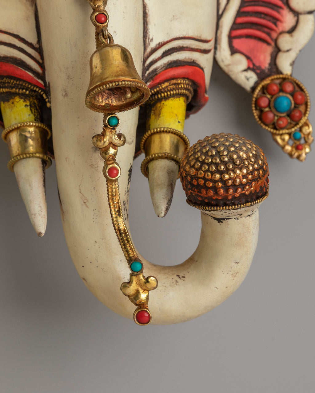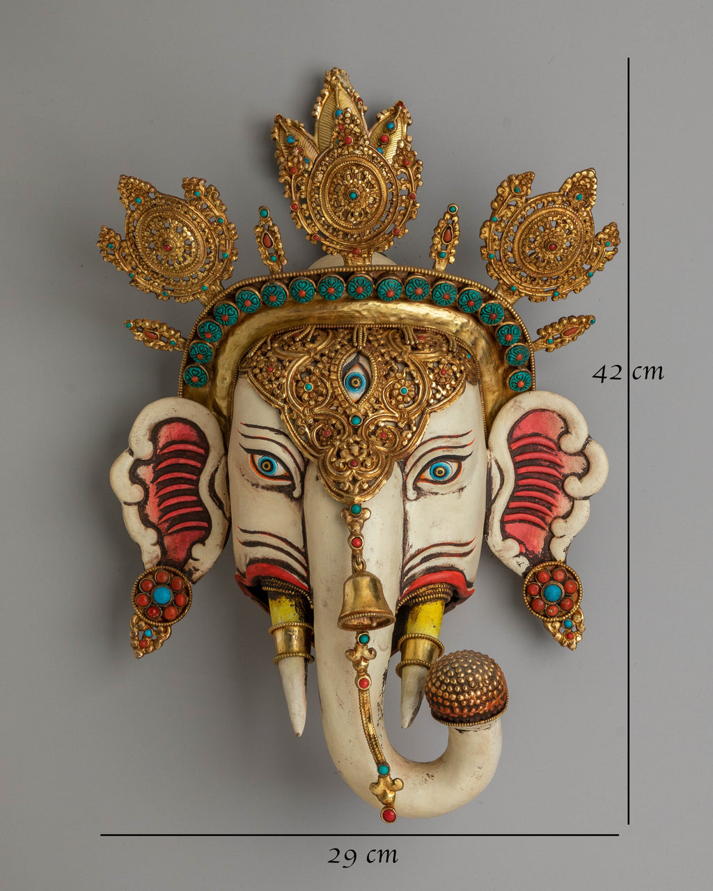 The design of the wall hanging showcases a highly detailed face with gemstone eyes and a gold-plated crown, representing divine protection and spiritual enlightenment. The gold-plated copper body not only adds a touch of elegance but also symbolizes the Buddha's wisdom and the transformative power of spiritual practice. The acrylic colors bring the face to life, highlighting the intricate patterns and symbolic motifs that represent the harmony between the earthly and the divine. The gemstones further enhance the piece's visual appeal, adding color and energy.
