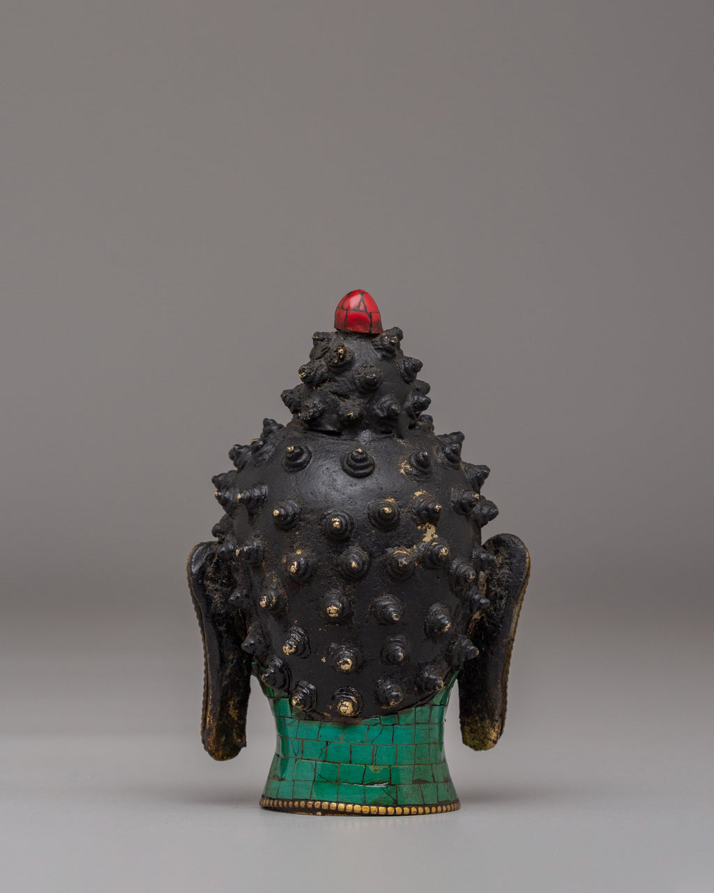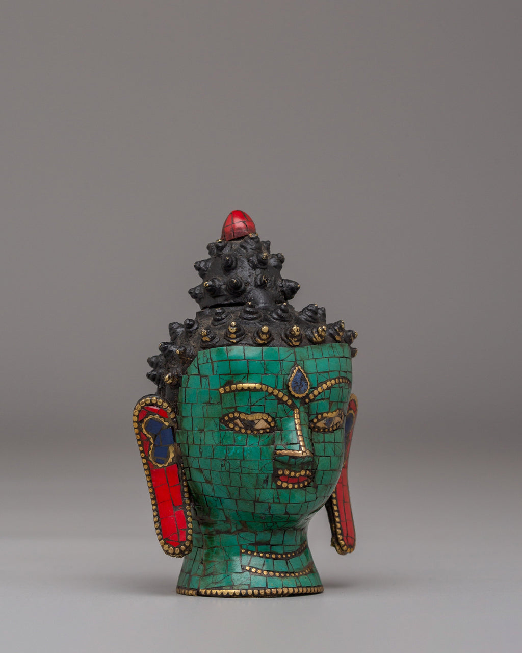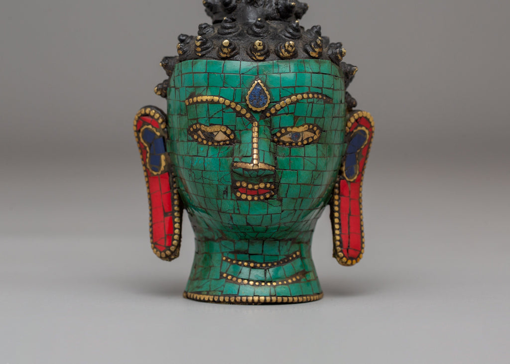 This handcrafted Buddhist Buddha Head Statue is made from brass and adorned with vibrant acrylic colors, along with carefully inlaid coral red stones, lapis lazuli, and turquoise. Measuring 10.5 cm in height and 8.5 cm in width, it weighs 0.24 kg. The serene expression and intricate detailing make this statue a meaningful addition to any meditation space, altar, or home decor.