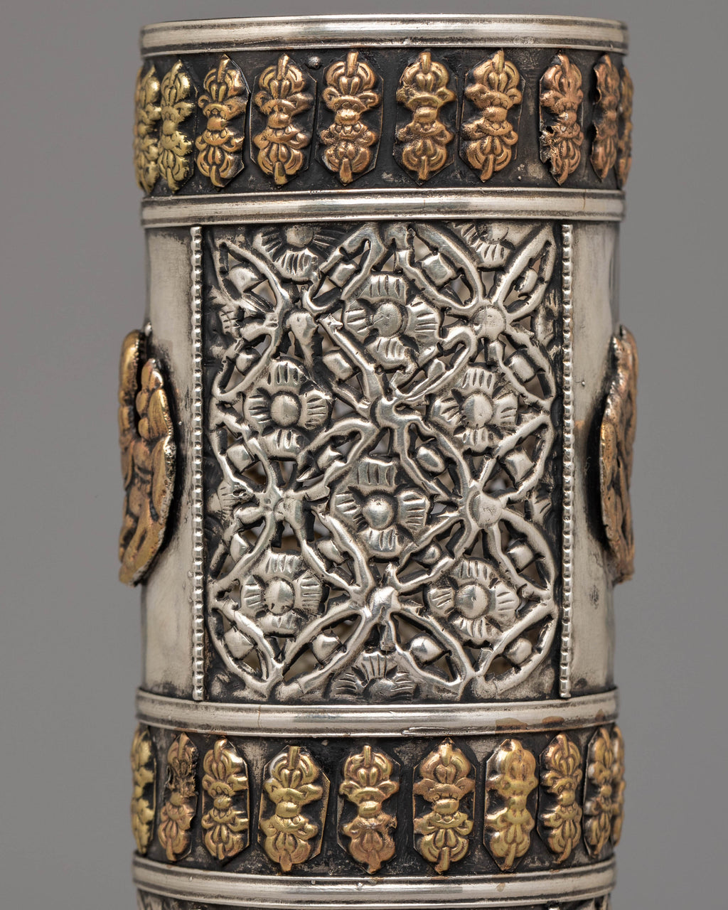 This beautifully handcrafted incense holder embodies traditional Himalayan craftsmanship and spiritual devotion. Made from copper with electro-gold plating, it features intricate gemstone inlays. Designed to hold ritual incense sticks, this offering bowl is a meaningful addition to any altar or meditation space, enriching your practice with purity, intention, and beauty. Its elegant form and radiant finish make it both a functional ritual tool and a stunning decorative piece that enhances the spiritual atmosphere of your home.