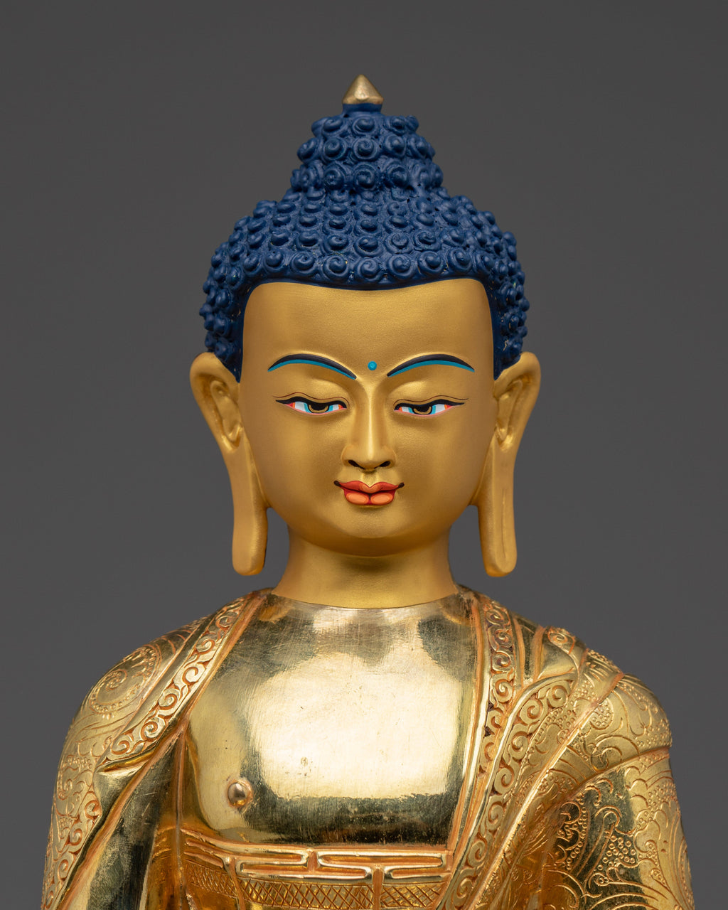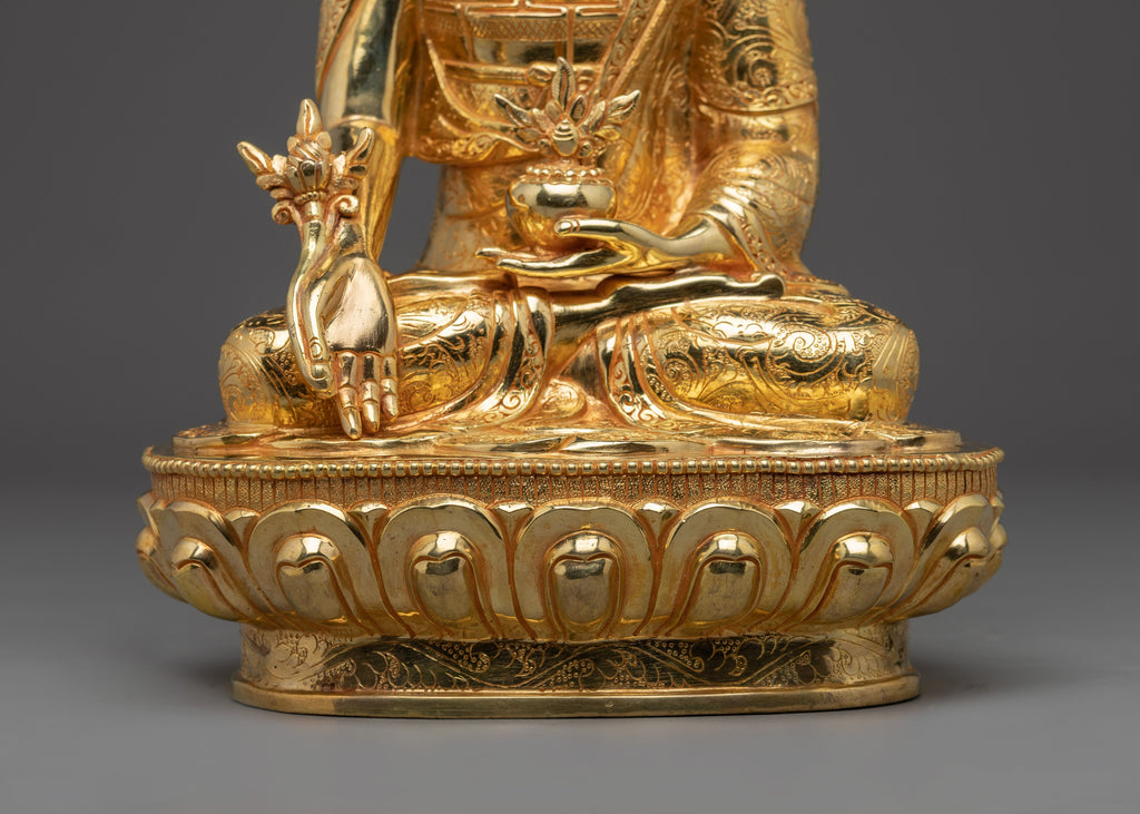 Buddhist Healing Art of Medicine Buddha measuring 12.8”/32.5cm in height and 8.7”/22cm at the base, it weighs 3.31 kg. It is made from copper and richly adorned with 24K gold gilding and intricate gold and acrylic paintings. A revered symbol of healing and inner peace, this statue embodies the compassionate energy of the Medicine Buddha, making it a perfect addition to your altar, meditation space, or spiritual collection.