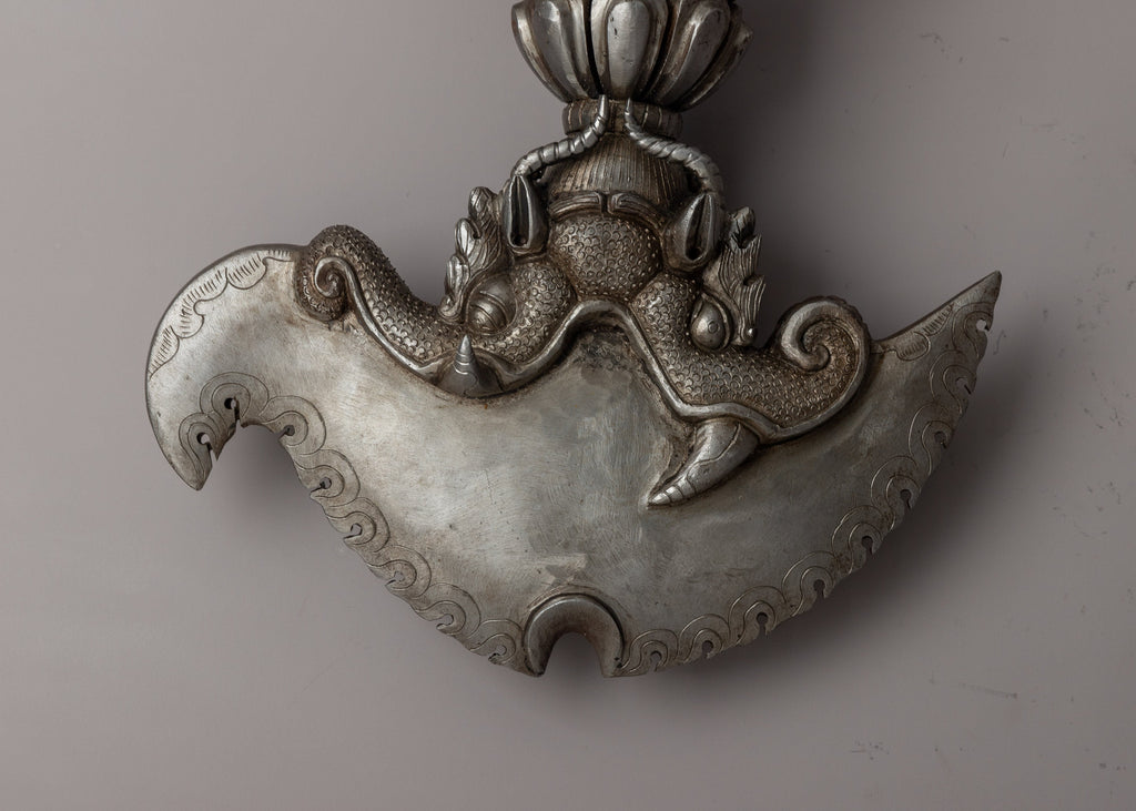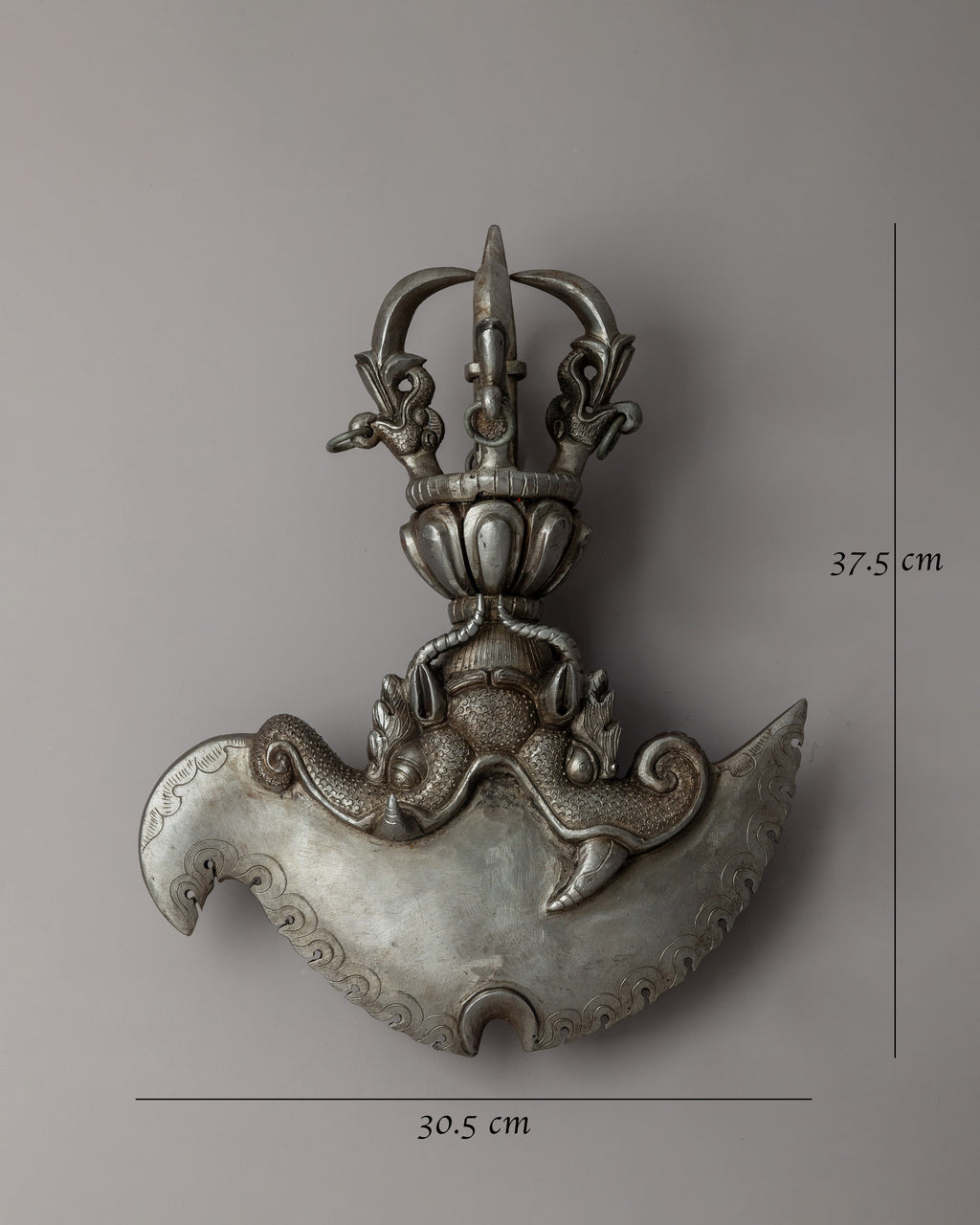 The Buddhist Iron Kartika Knife is an intricately hand-carved artifact with deep spiritual significance in Tibetan Buddhism. Crafted from iron, this sacred blade features a flat, sharpened edge with a curved hook at its outer extremity, symbolizing the ability to cut through ignorance and attachment. The Makara, a mythical sea creature, is prominently displayed with its mouth wide open, appearing to hold the blade, signifying protection and transformation. Atop the handle, a half-vajra is present, symbolizing indestructibility and enlightenment. The combination of these elements makes this Kartika knife a decorative masterpiece and a symbolic representation of spiritual awakening in Buddhist traditions.