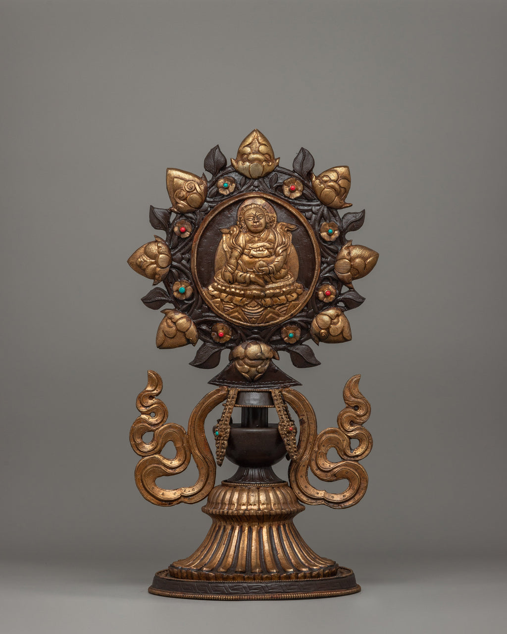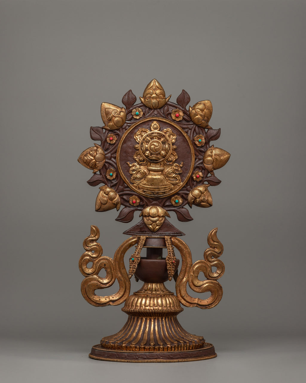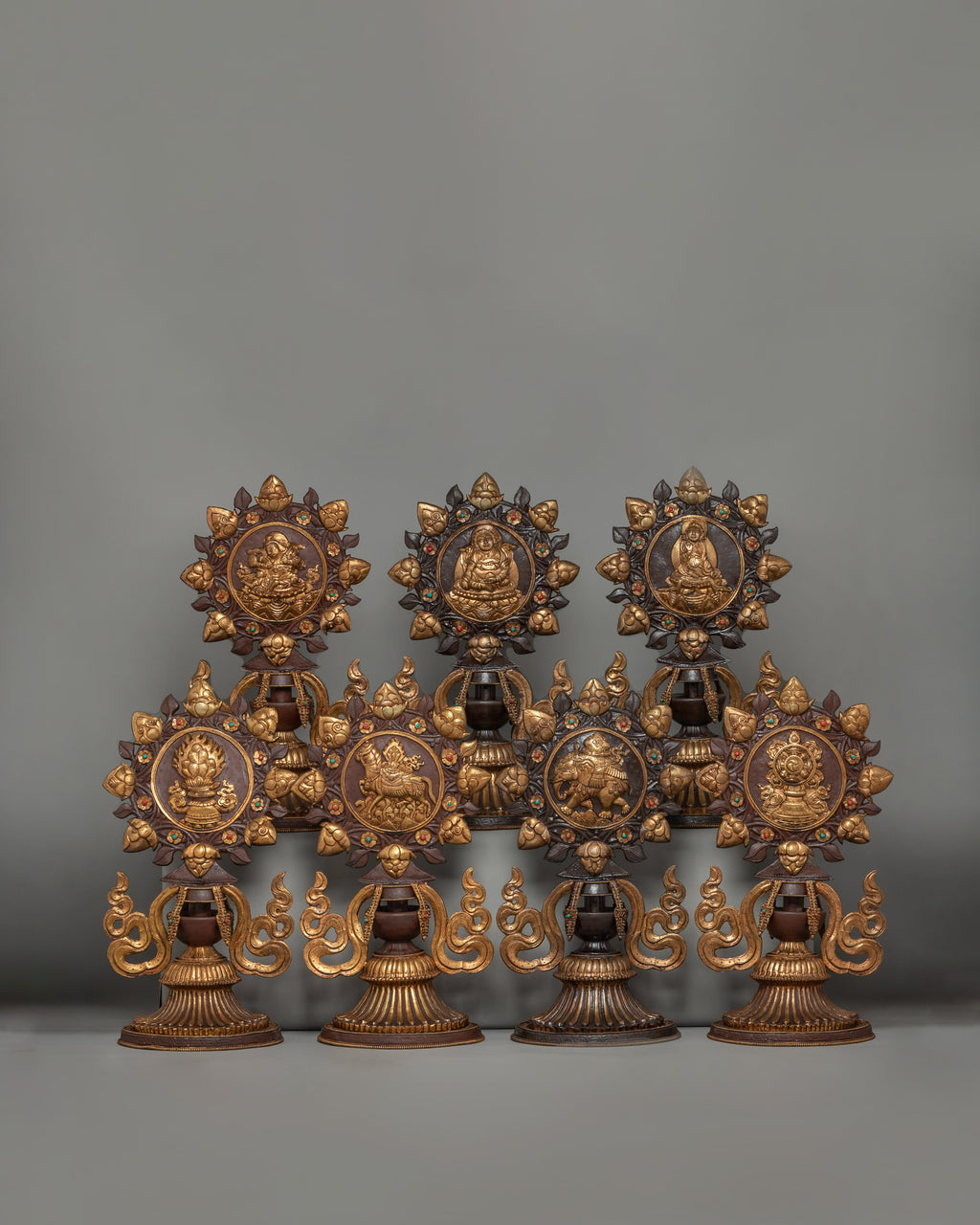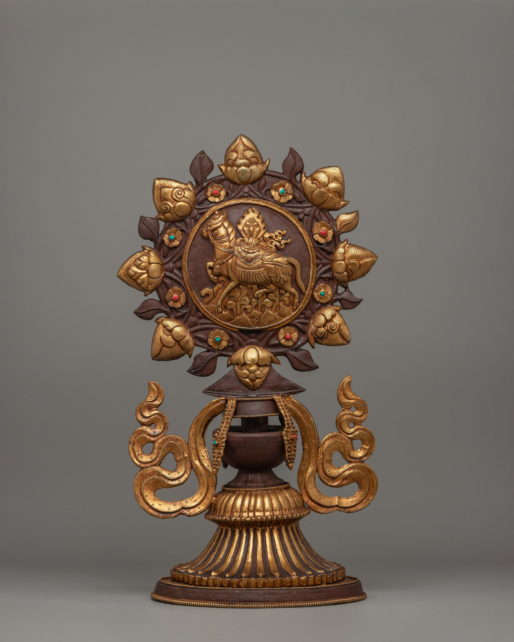 The King and Queen are central to the design, representing royal wisdom and compassion, ruling with righteousness, and guiding devotees to enlightenment. Surrounding them with offering set and the Dharma Wheel, which represents Buddha's teachings as well as the eternal cycle of life and reincarnation. Below this sacred emblem is a protector deity, a powerful guardian who protects practitioners from negativity and impediments. The horse and elephant sculptures at the base indicate strength, perseverance, and auspicious energy. These all are important attributes in Buddhist practice.