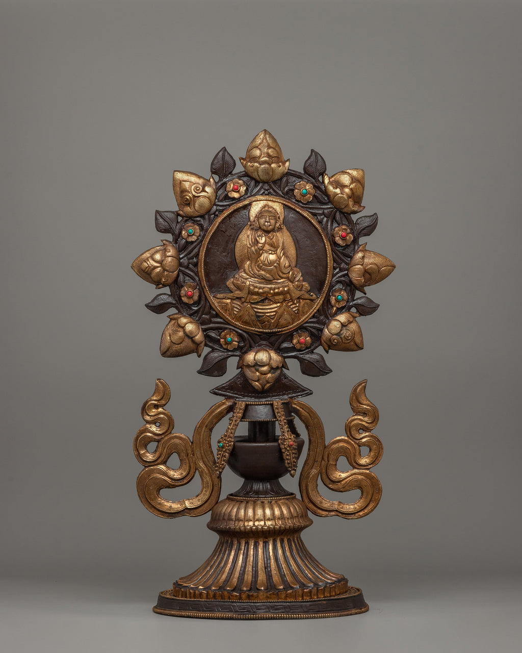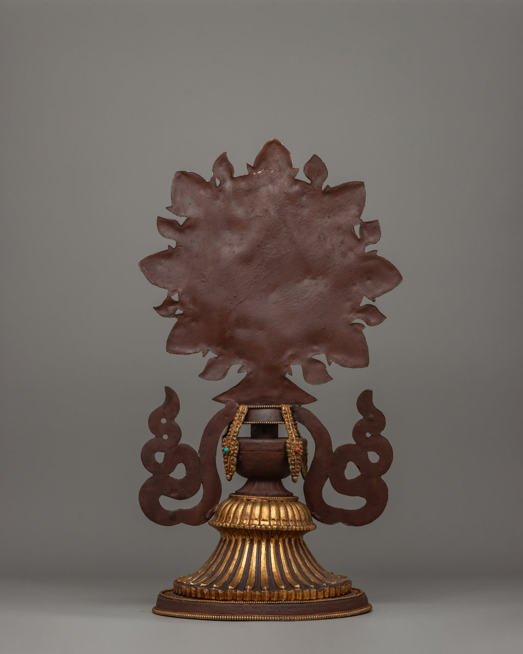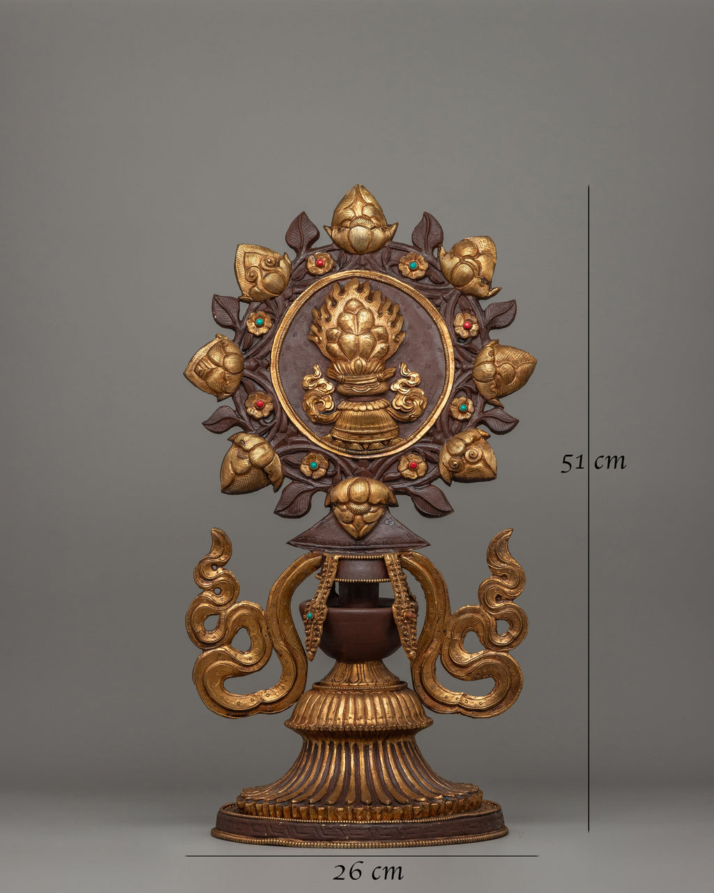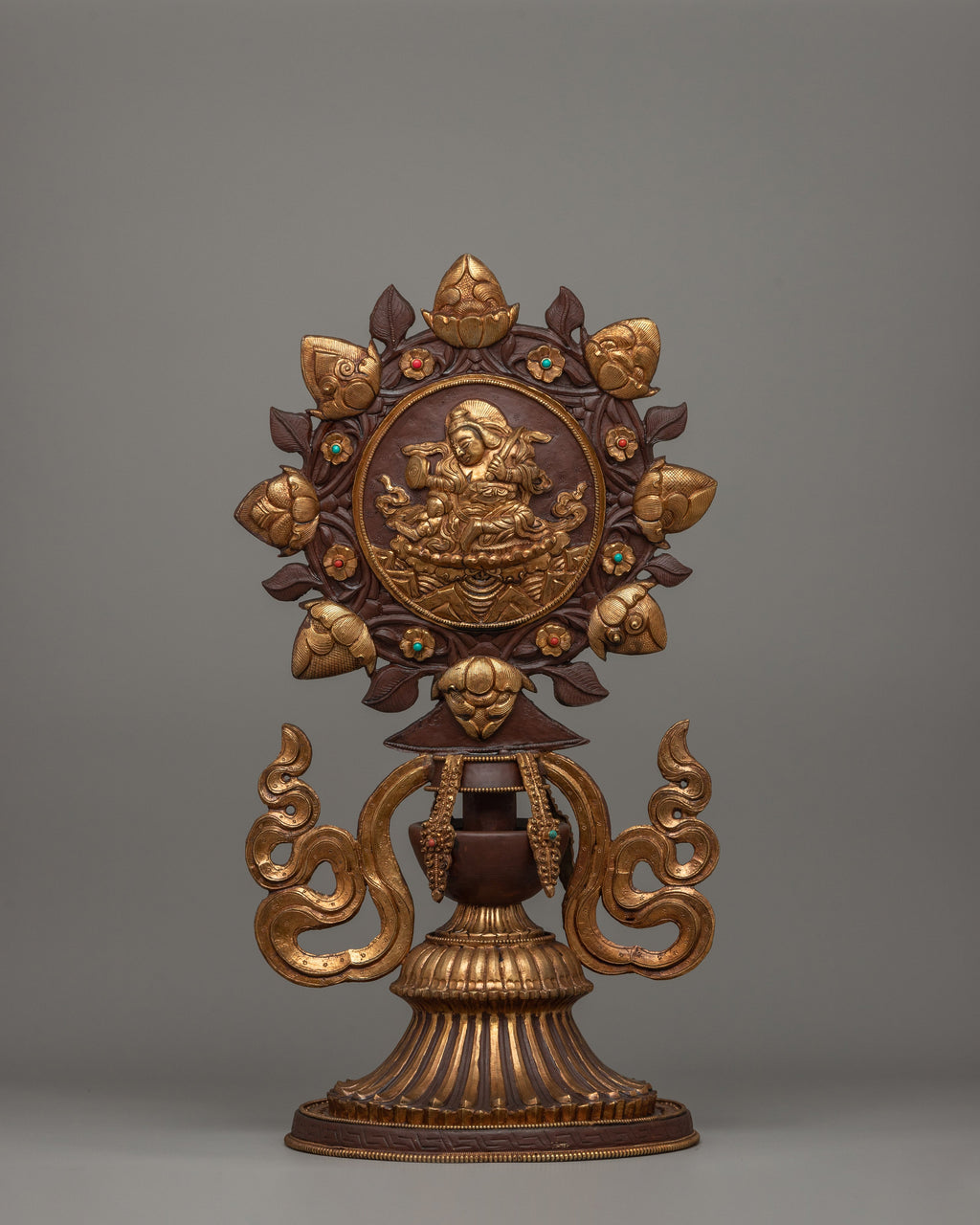The King and Queen are central to the design, representing royal wisdom and compassion, ruling with righteousness, and guiding devotees to enlightenment. Surrounding them with offering set and the Dharma Wheel, which represents Buddha's teachings as well as the eternal cycle of life and reincarnation. Below this sacred emblem is a protector deity, a powerful guardian who protects practitioners from negativity and impediments. The horse and elephant sculptures at the base indicate strength, perseverance, and auspicious energy. These all are important attributes in Buddhist practice.