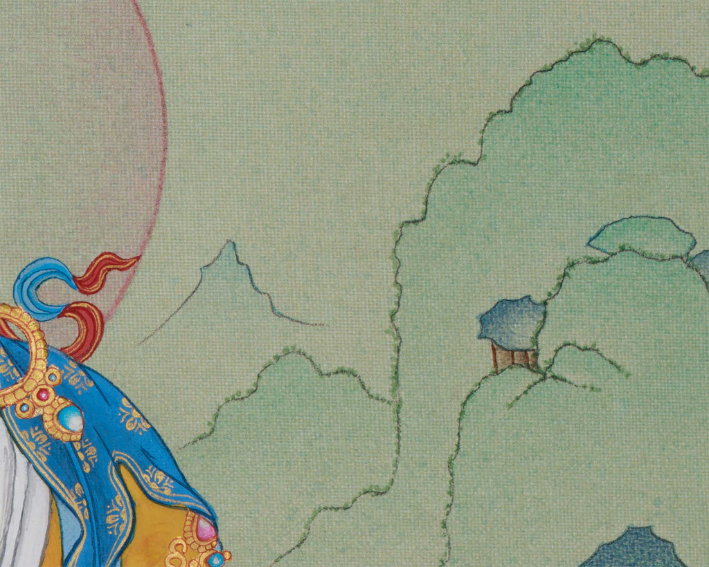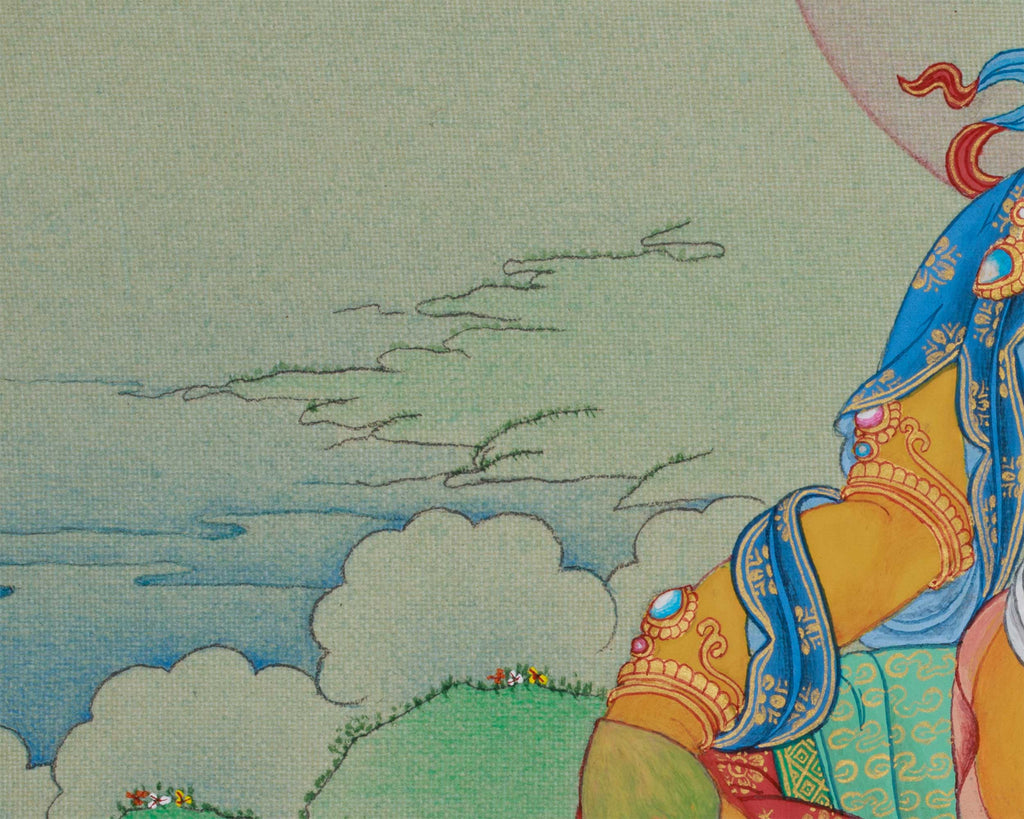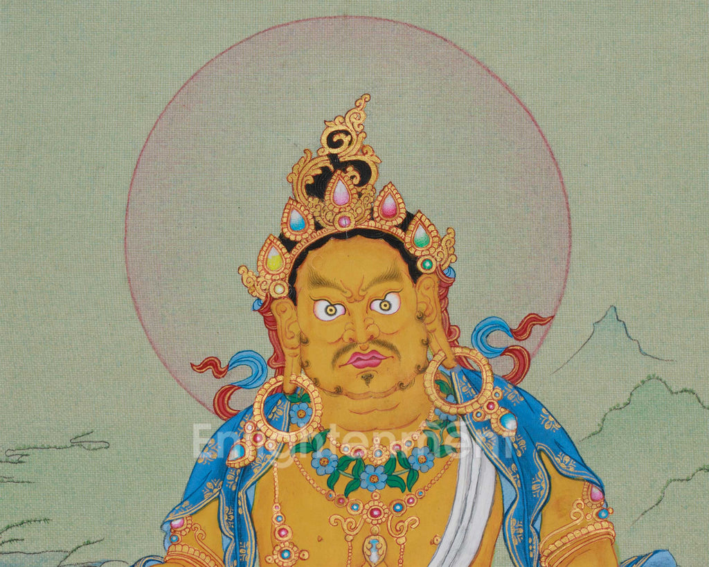The hand-painted thangka of Kubera, guardian of wealth, was created on cotton canvas with 24K gold and natural stone colors, symbolizing material fortune and spiritual richness. Painted in the traditional Karma Gadri Style, it features delicate brushwork, soft gradients, and detailed ornamentation. Gold accents shimmer across his crown, jewelry, and silk scarf, highlighting his regal aura while enhancing the divine energy he radiates. This thangka attracts prosperity and success, harmonizing your environment with stability, wealth, and generosity.