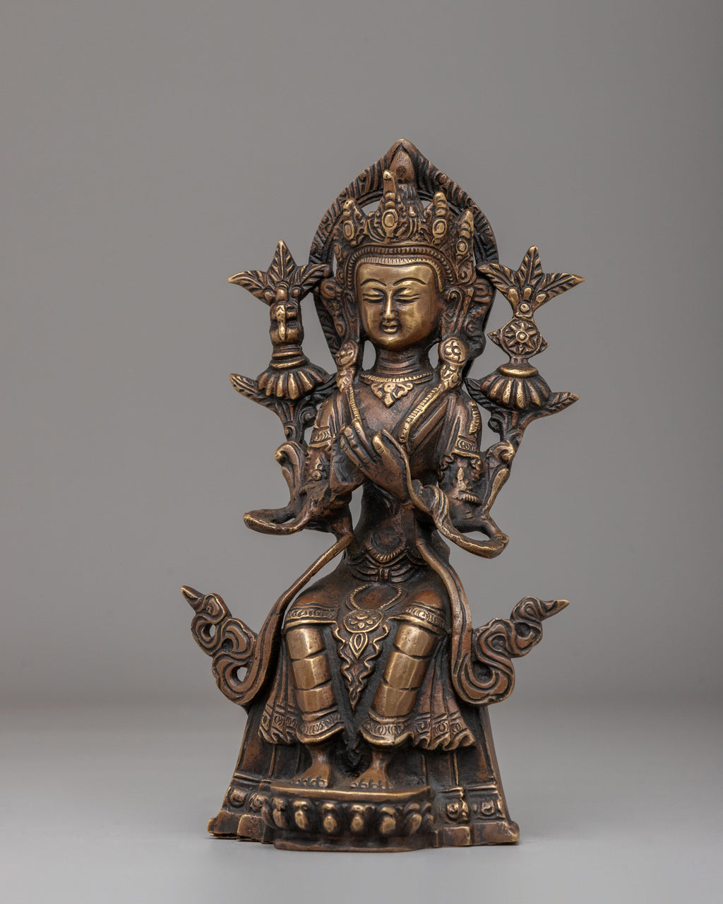 Maitreya Buddha is revered as the future Buddha in many Mahayana Buddhist traditions. Believed to appear on Earth to alleviate suffering and disseminate Buddhist teachings, he is often depicted seated on a lotus base with a serene expression. Sometimes shown holding a vase, which symbolizes his role as a teacher and dispenser of Buddhist knowledge, Maitreya embodies compassion and wisdom. He serves as a source of inspiration for practitioners, reminding them of the potential for enlightenment and the promise of a better future.
