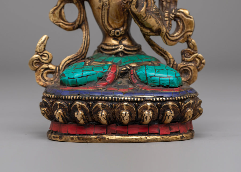 This Manjushri Figurine for Meditation measures 16 cm in height , 11.5 cm in width and weighs 0.83 kg. Crafted from brass and adorned with coral red stone, lapis lazuli, and turquoise, the statue has a balanced and stable structure suitable for placement on a home altar, meditation table, prayer space, or display shelf. Its size makes it ideal as a devotional focal point in both personal and sacred environments.