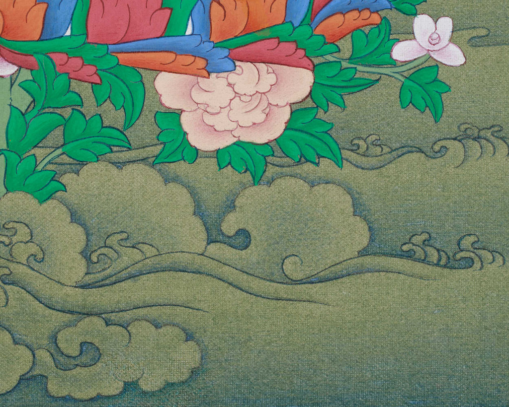 Guru Rinpoche’s life is filled with symbolism and miracles. Born from a lotus in Lake Dhanakosha, he was invited to Tibet in the 8th century by King Trisong Detsen to establish the Dharma. Through tantric mastery, he turned obstacles into protectors and hid spiritual treasures (terma). As the founder of the Nyingma lineage, he is revered as an awakened master who has guided practitioners for centuries. This thangka shows Guru Rinpoche seated on a lotus on a moon disc, symbolizing purity and an awakened mind. He wears a lotus hat with a half-vajra and a vulture feather, representing wisdom. His right hand holds a five-pronged vajra; his left, a skull cup with nectar, signifying wisdom. The khatvanga staff, with its severed heads and trident, symbolizes the transformation of poisons into wisdom. His robes and expression reflect discipline and mastery. This thangka fosters meditation, devotion, and a sense of sacred space—invite Guru Rinpoche's blessings to deepen your practice.
