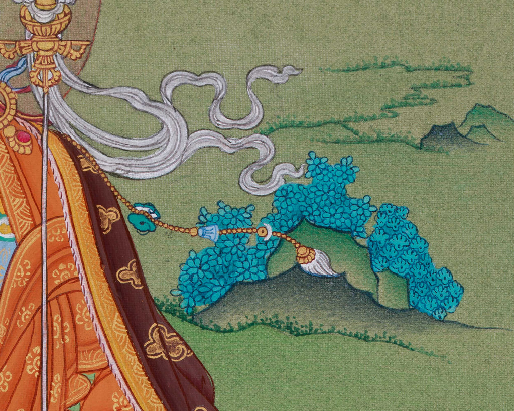 The Buddhist Master Guru Rinpoche Thangka is a beautifully hand-painted religious artwork on carefully prepared cotton canvas, exuding an enlightened presence and eternal spiritual authority. Rich, long-lasting hues are achieved by carefully layering natural stone pigments, and 24K gold adds radiant brilliance to the ornaments, tools, and minute details. This thangka, created in the elegant Karma Gadri style, renowned for its expansive landscapes and well-balanced composition, combines profound devotional meaning with artistic refinement. In Tibetan Buddhism, Guru Rinpoche, also called Padmasambhava, is regarded as the "Second Buddha" for bringing Vajrayana teachings to Tibet.