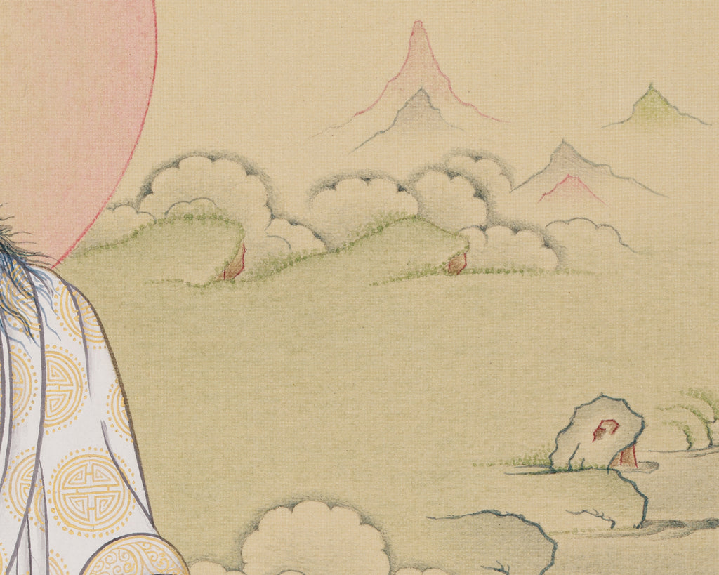 Discover the profound spiritual realm of Tibetan meditation through this Buddhist Master Milarepa Thangka. Created within our Enlightenment Studio, this handmade painting is executed on premium cotton canvas utilizing natural Lhasa stone pigments and 24K gold. The Thangka radiates both spiritual significance and aesthetic beauty. The stone pigments yield vibrant hues with enduring richness, while the gold accents highlight the sacred figures' divine nature. Adhering to the traditional Karma Gadri style, renowned for its serene design, intricate craftsmanship, and harmonious composition, this thangka functions as both an exquisite artwork and a revered object of devotion.