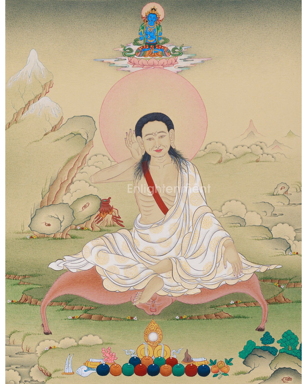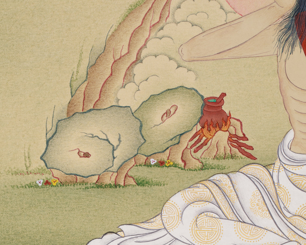 Milarepa, Tibet’s renowned yogi and poet, is celebrated for his devotion, meditation, and mastery of Vajrayana. Born in the 11th century, he faced early challenges, pursued intense spiritual practice, and attained enlightenment. His life exemplifies how devotion, discipline, and perseverance can transform the spirit, inspiring many to follow the path of meditation, compassion, and wisdom. This thangka depicts Milarepa in meditation, with one hand to his ear, symbolizing his mastery of poetry and music. Vajradhara at the top represents the source of blessings and wisdom. The art highlights the sacred bond between teacher and disciple, balancing practice and divine guidance. Every detail, from Milarepa's robes to Vajradhara's aura, is carefully made, inspiring devotion and reflection. Placing this thangka in your sacred space can inspire meditation, uplift your spirit, and connect you with Tibetan wisdom.