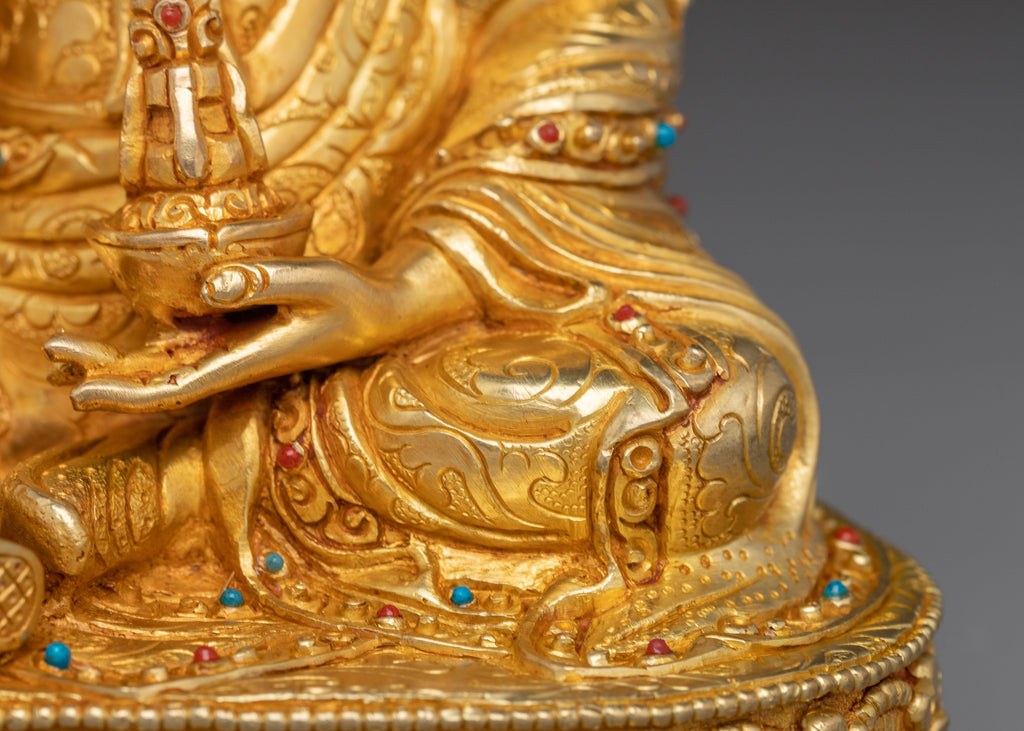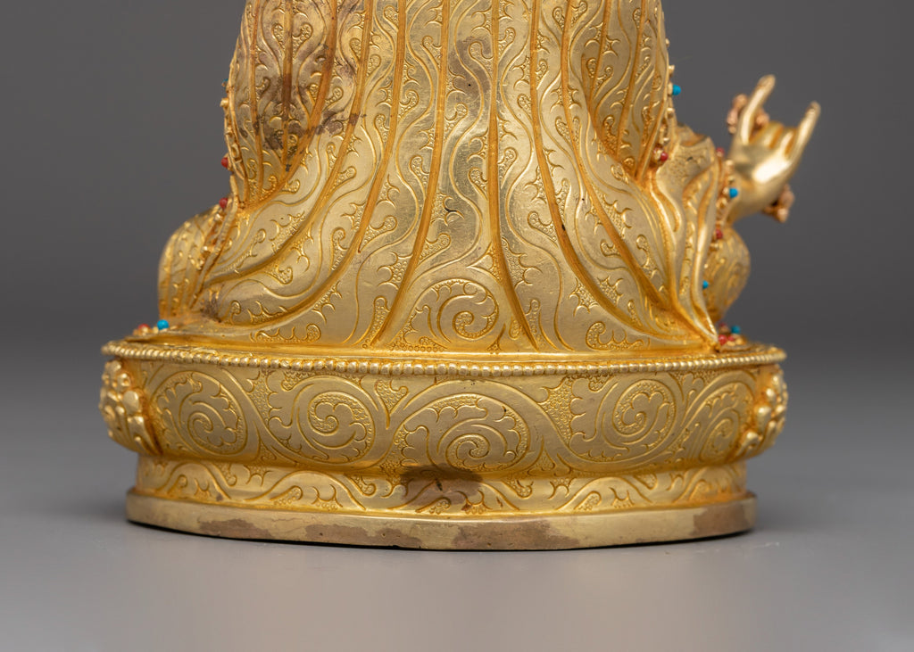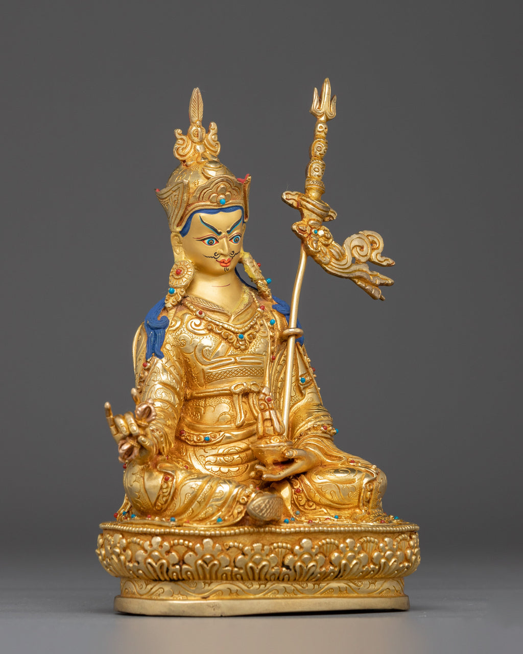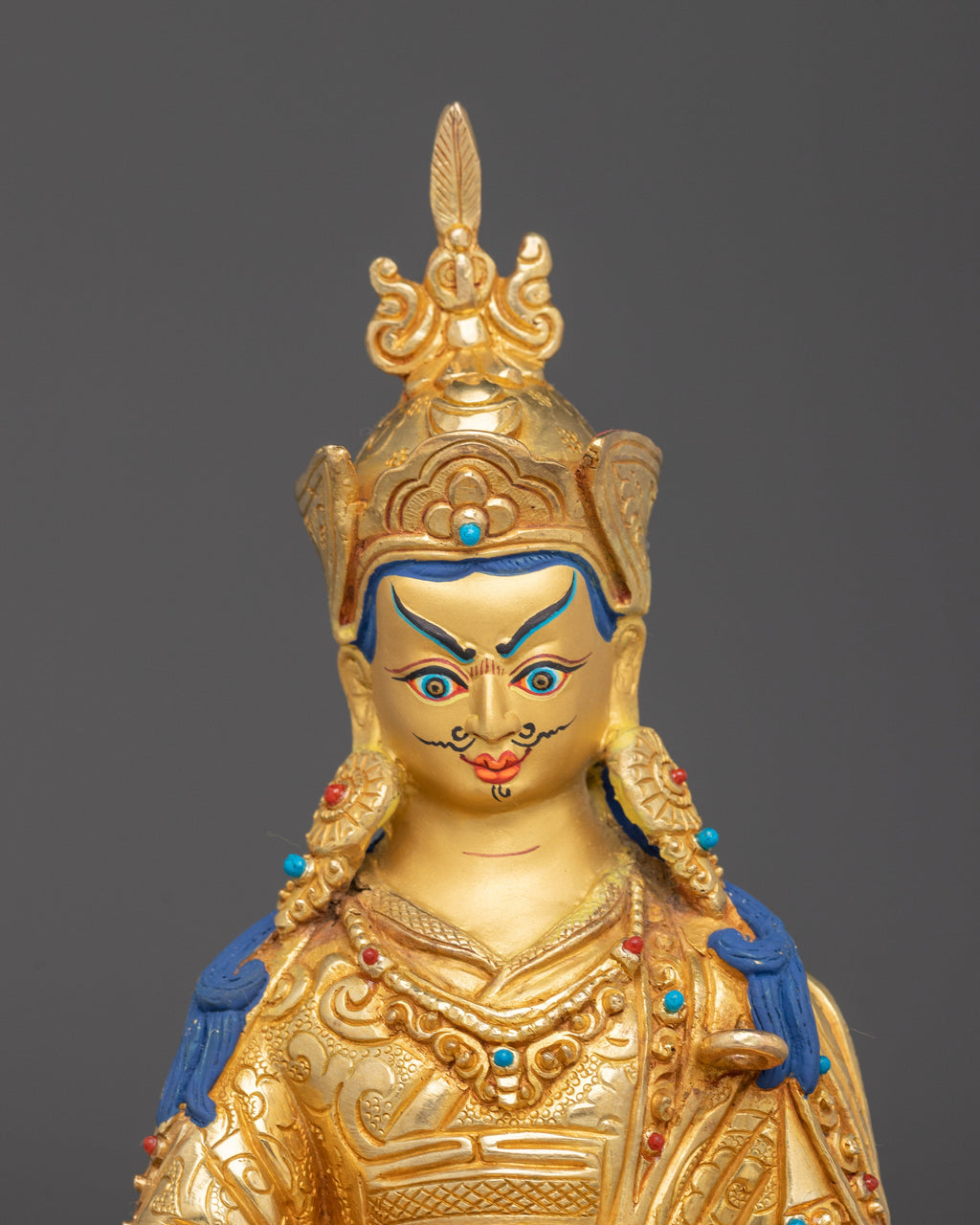 This Buddhist Master Padmasambhava Statue presents Guru Rinpoche, the "Precious Master" who brought Buddhism to Tibet in the 8th century. Crafted from copper and beautifully gold-plated, this masterpiece exudes spiritual presence and traditional artistry. Padmasambhava sits in royal ease upon an ornate lotus throne, holding his vajra symbolizing indestructible wisdom, while his left hand cradles a skull cup representing transformation. The khatvanga staff against his shoulder, topped with a trident, represents the union of wisdom and compassion. Turquoise and coral stone inlays on the face, crown, and robes add vibrant accents. His fierce yet compassionate expression with intense blue-inlaid gaze captures his ability to subdue obstacles and protect practitioners.