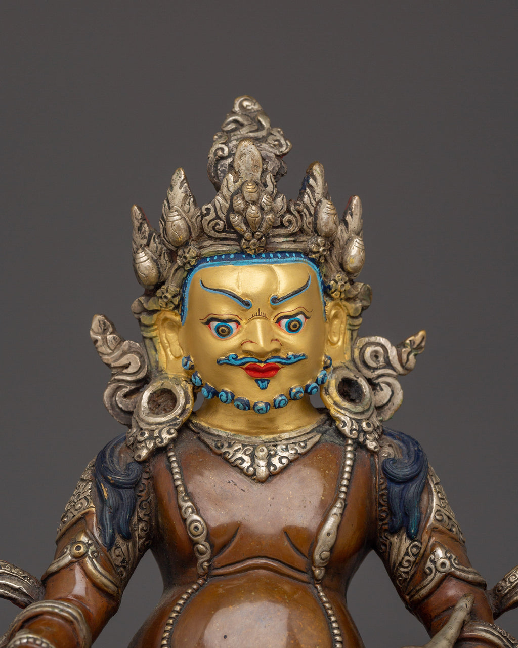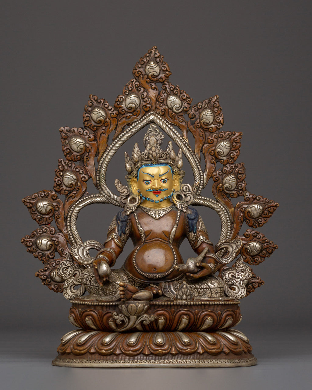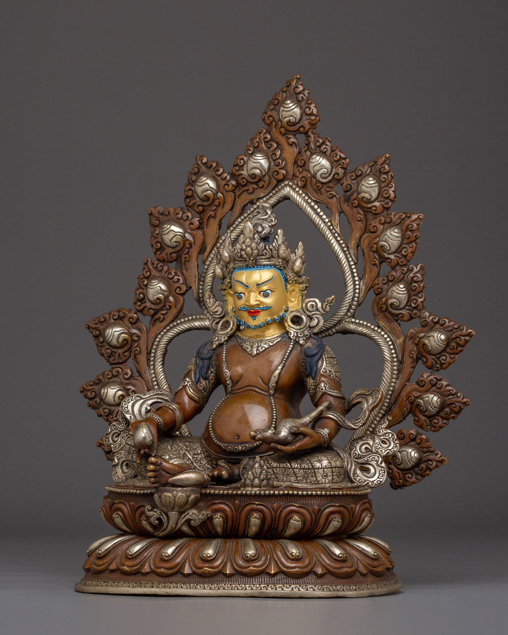 Buddhist Prosperity Dzambhala measures 12.6 inches (32 cm) in height with a base width of 10.2 inches (26 cm) and weighs 2.99 kg. Made from oxidized copper, it features silver plating and detailed gold and acrylic paintings, combining durability with rich artistic detail.