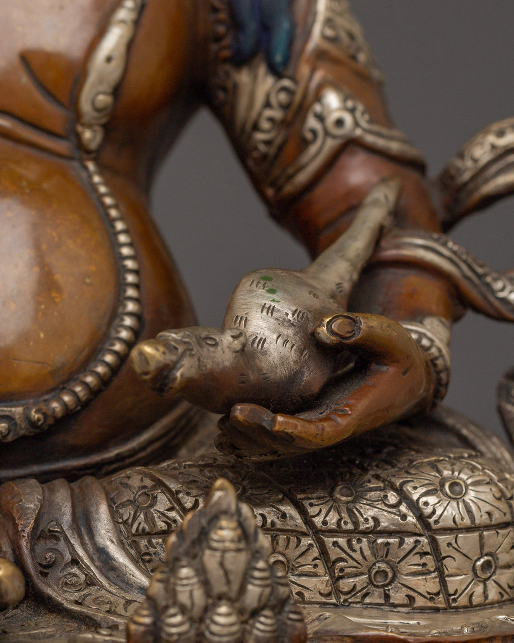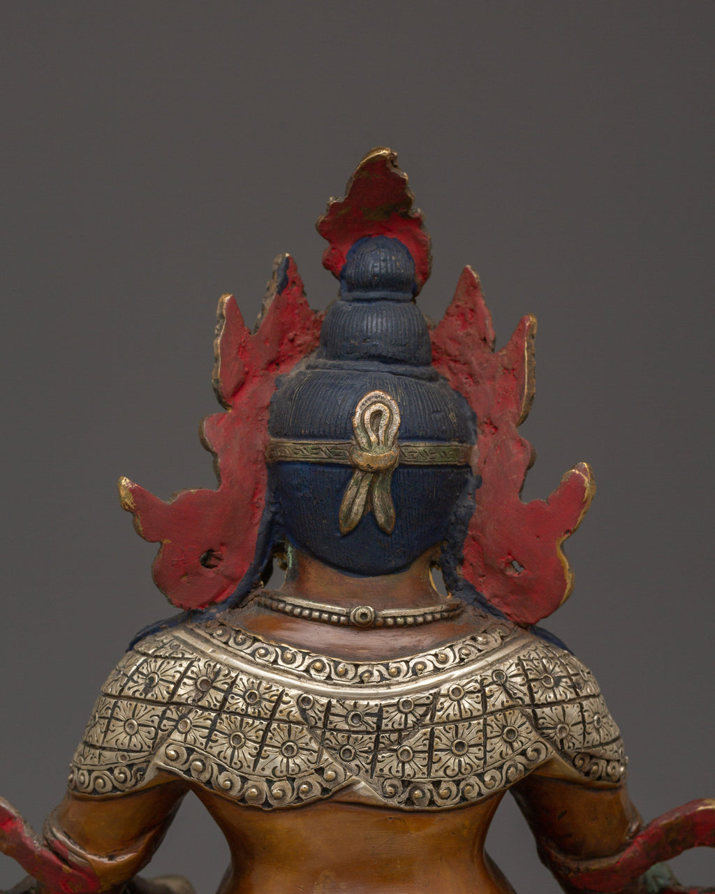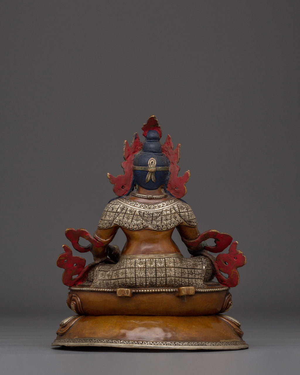 Buddhist Prosperity Dzambhala measures 12.6 inches (32 cm) in height with a base width of 10.2 inches (26 cm) and weighs 2.99 kg. Made from oxidized copper, it features silver plating and detailed gold and acrylic paintings, combining durability with rich artistic detail.