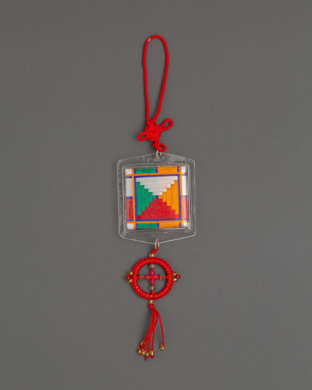 Measuring 7.5 cm in height and 6.5 cm in width, and weighing just 0.026 kg, this amulet is lightweight yet carries profound symbolic value. The total hanging length of 28 cm makes it suitable for hanging in cars, homes, offices, or meditation spaces. Its design combines traditional artistry with sacred symbolism, ensuring it not only serves as a charm of spiritual safety but also as a decorative piece that radiates peace and harmony. Woven with care from canvas thread and protected by a plastic cover, the amulet embodies sacred craftsmanship rooted in Buddhist tradition.