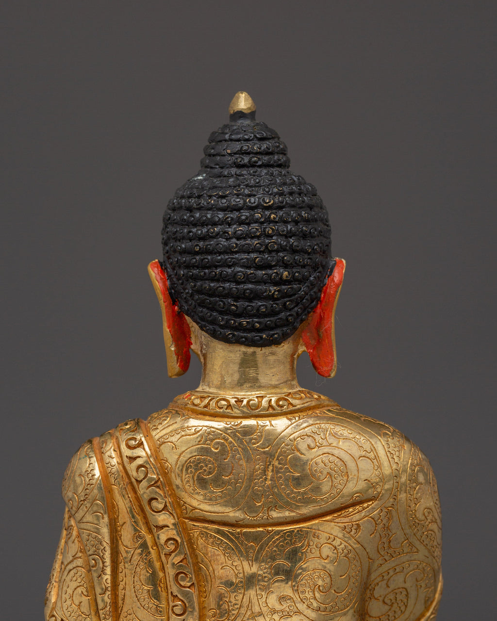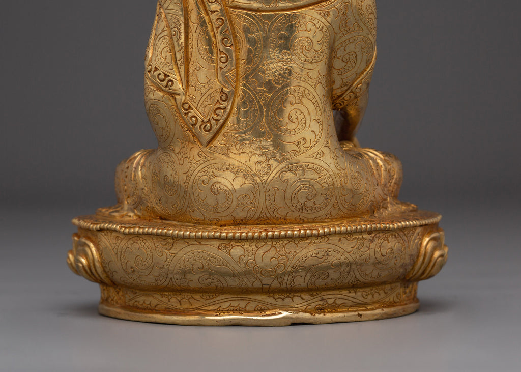 Buddhist Protector Mitrupa measures 8.3 inches (21 cm) in height with a base width of 6.5 inches (16.5 cm) and weighs 1.77 kilograms. Crafted from an oxidized copper body, it is beautifully adorned with 24K gold gilding and detailed gold and acrylic paintings. The intricate design and fine craftsmanship highlight the statue’s serene expression and spiritual essence, making it an ideal piece for meditation spaces, personal altars, or as a meaningful decorative item symbolizing enlightenment and peace.