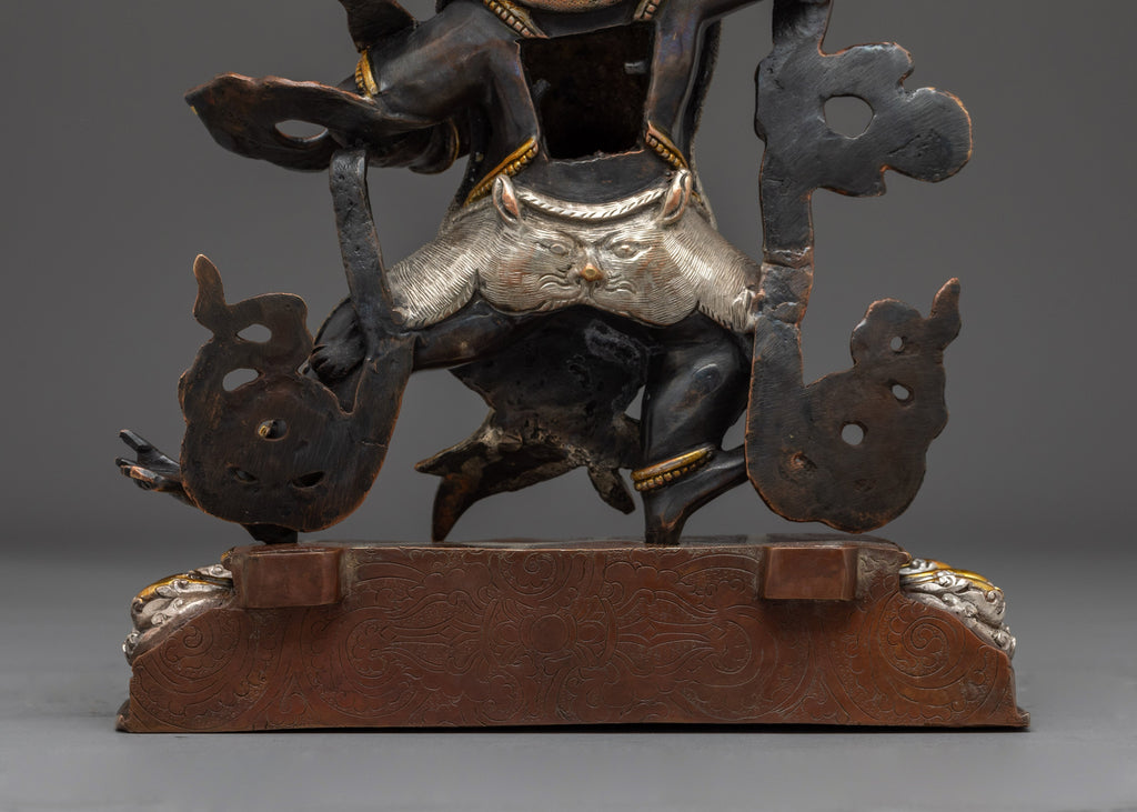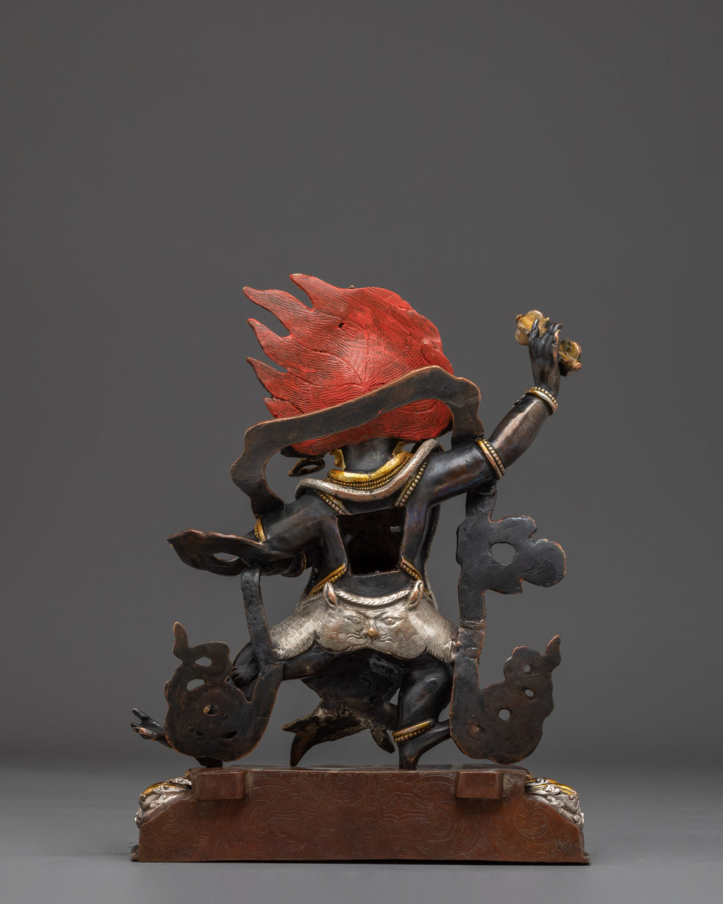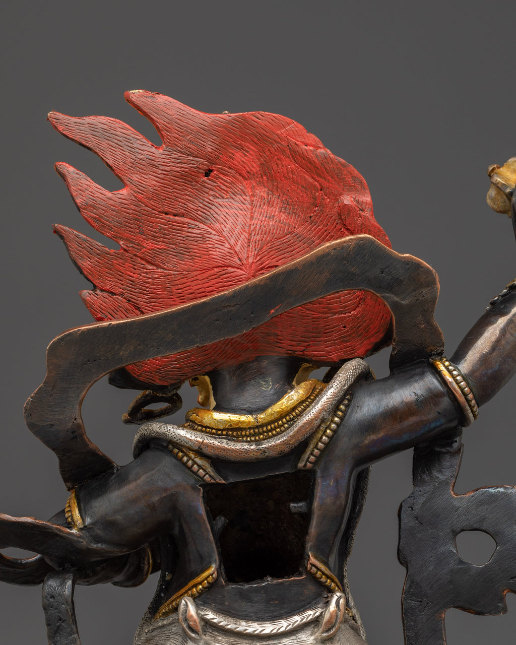 His bulging eyes, sharp fangs, and fiery eyebrows symbolize his fierce determination to destroy ignorance and protect spiritual practitioners. His blue body represents his vajra nature, symbolizing indestructibility and the transformation of anger into wisdom. Bone ornaments and skull garlands signify impermanence and mastery over ego and fear. The right hand holds a vajra, symbolizing spiritual power to annihilate ignorance. The left-hand lasso binds harmful forces. A warrior-like stance with one leg bent forward and the other extended backward, symbolizing readiness and active engagement in protecting the Dharma. A fiery halo represents purification and transformation through wisdom. He is in Bhutadamara Mudra, which is associated explicitly with subduing spirits and harmful forces. This gesture is characterized by the crossing of wrists, with the palms facing outward and the little fingers linked, forming a chain-like shape. The mudra resembles Garuda's wings and symbolizes a threatening yet protective stance, aimed at taming unruly spirits and dispelling negativity.