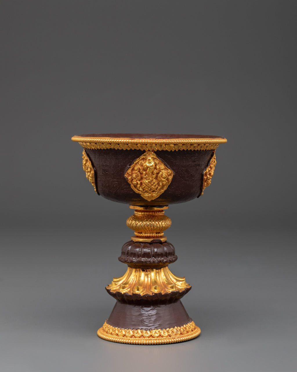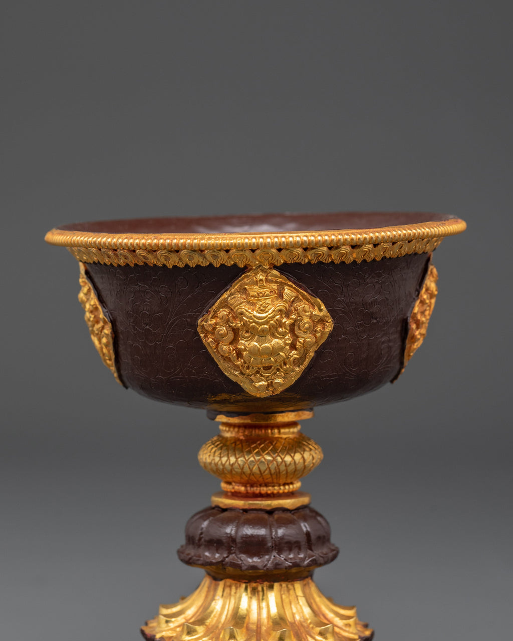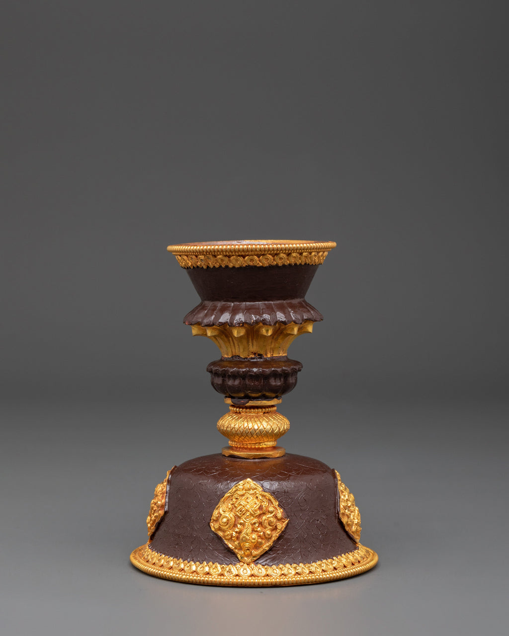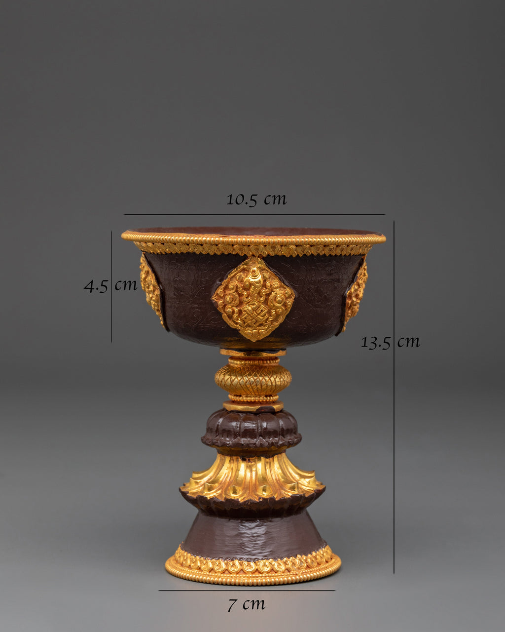 This intricately designed lamp is both a stunning work of art and a vital tool for Buddhist rituals. Its carefully crafted base, featuring lion motifs, adds to its spiritual significance. With an inner depth of 4.5 cm and a diameter of 10.5 cm, it is perfectly sized to hold offerings during prayers. Weighing 0.30 kg, it offers an elegant presence, making it a respected addition to any altar or meditation space.