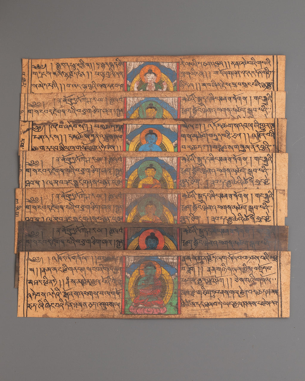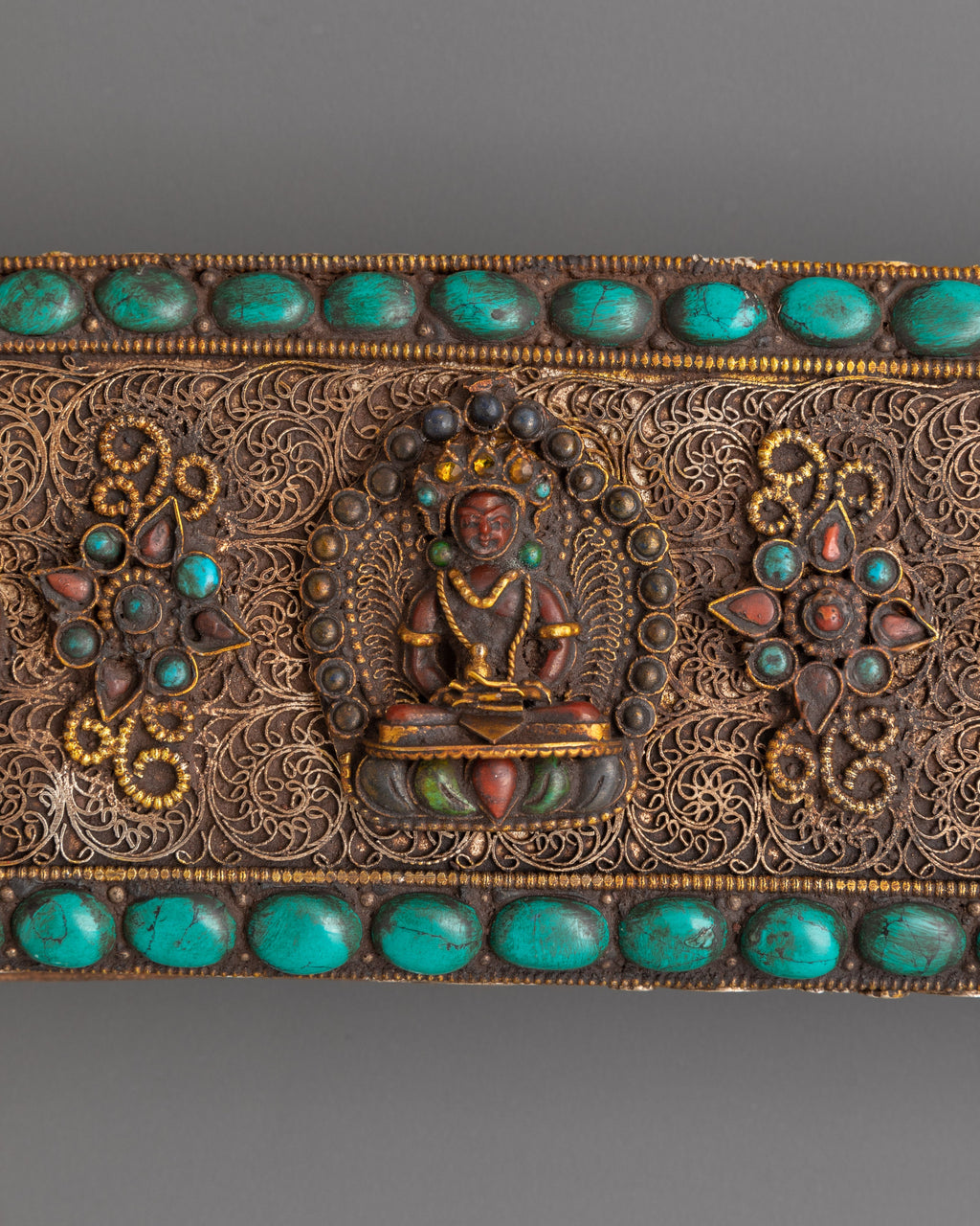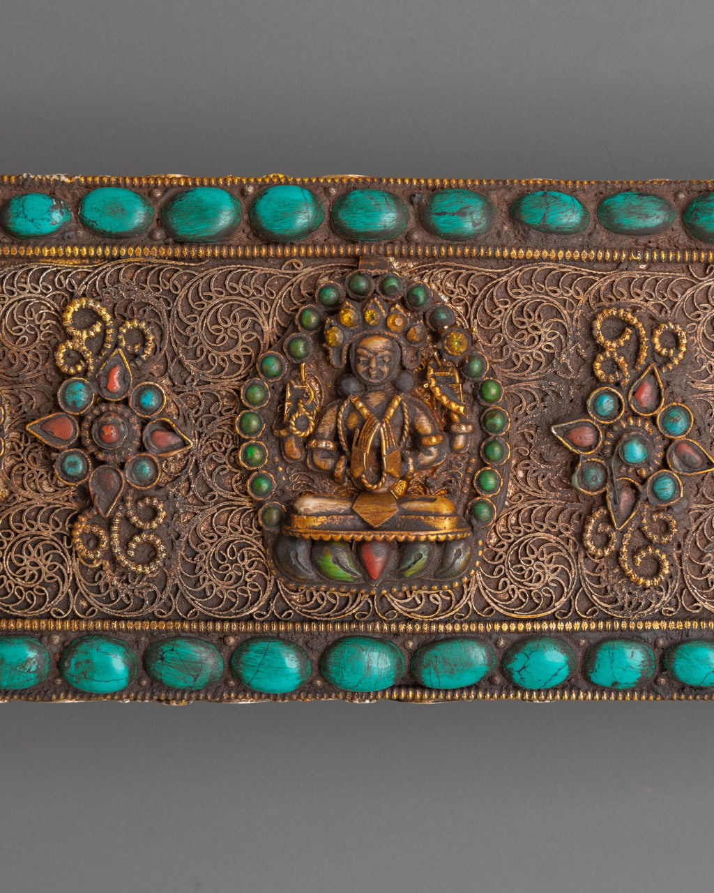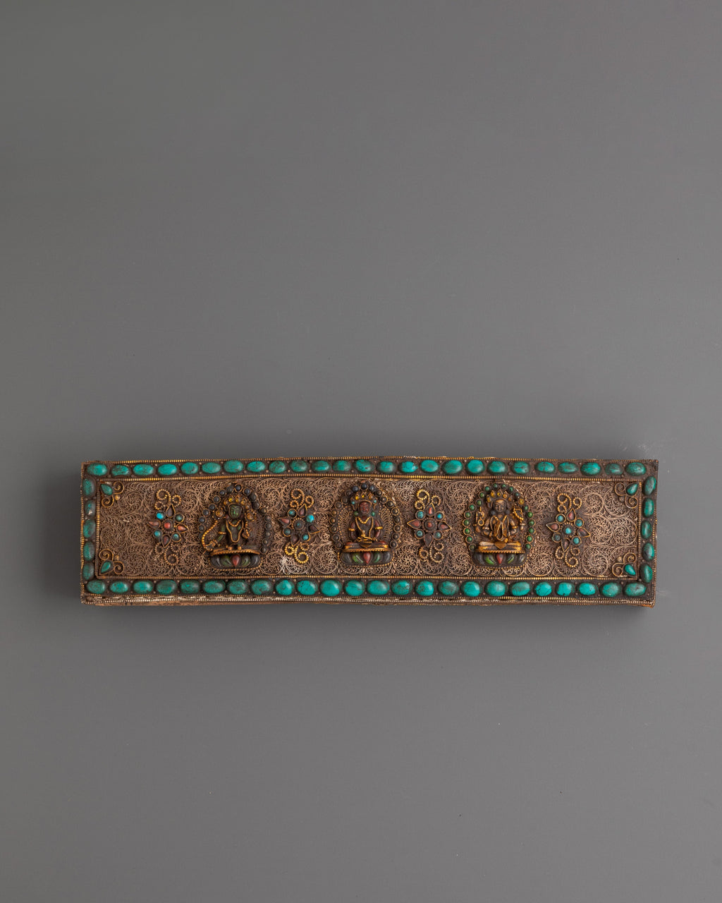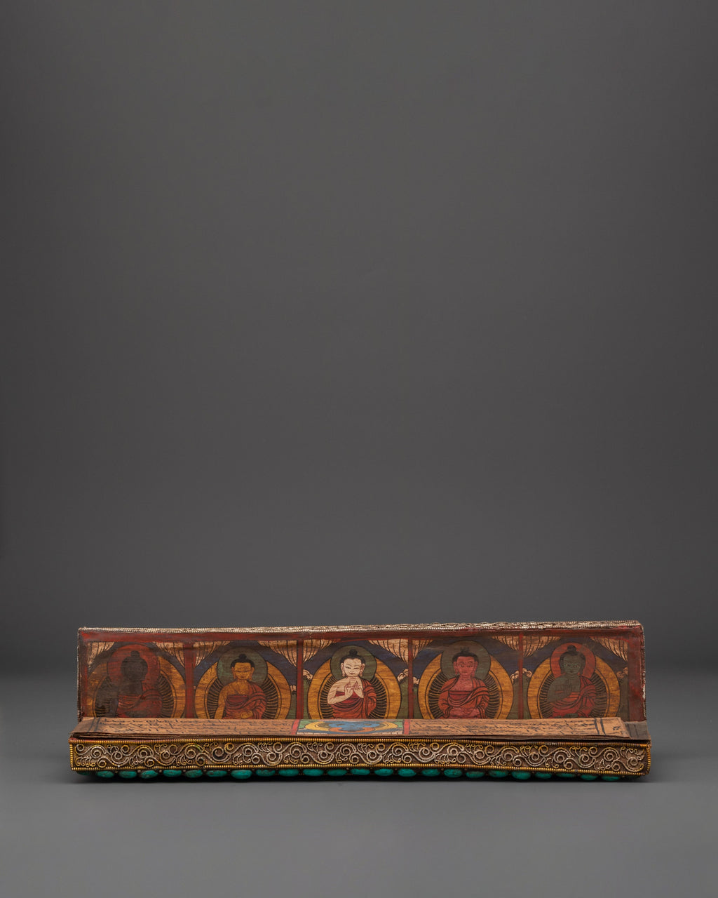 This Buddhist Sacred Text Protector, a stunning fusion of spiritual symbolism and traditional craftsmanship, will help you honor and protect your sacred scriptures. This sacred book cover, measuring 34.5 cm in width and 8.5 cm in height, is designed to preserve Buddhist teachings with care and respect. Its surface is adorned with three intricate Buddha figures that represent wisdom, protection, and spiritual awakening. This precious artifact is more than just a protective cover; it is a devotional piece intended to preserve the teachings of enlightenment.