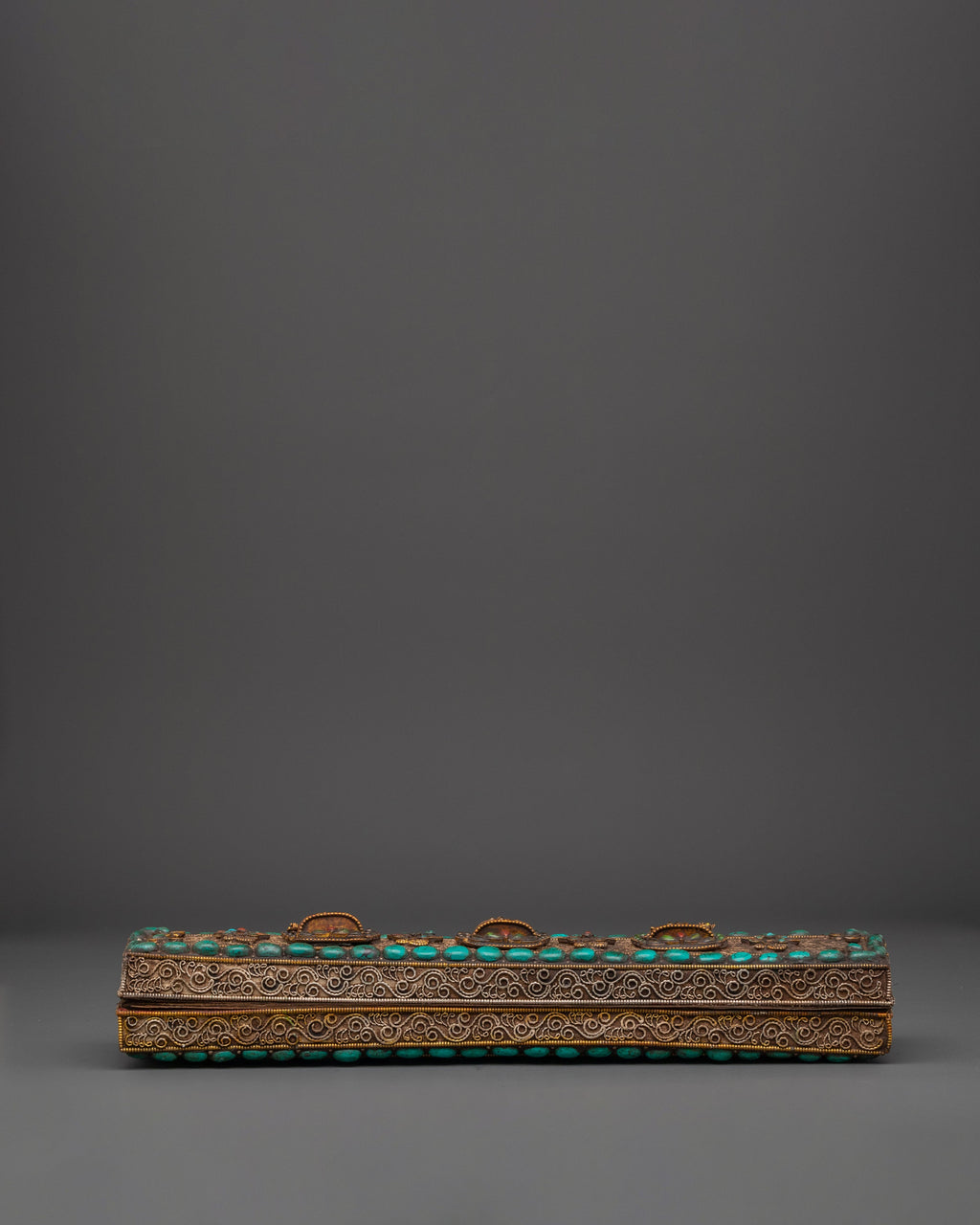 This scripture cover, crafted from solid metal and finished with silver plating, gold accents, and intricate engravings, exudes a profound sense of spiritual significance. Artificial turquoise stones line the margins and surround each god, adding to the design's visual appeal and energetic balance. The vibrant turquoise contrasts nicely with the worn silver finish, providing a sense of timeless depth. This guardian is more than simply a useful item; it is a shrine-worthy artifact that will enhance any spiritual setting or altar.