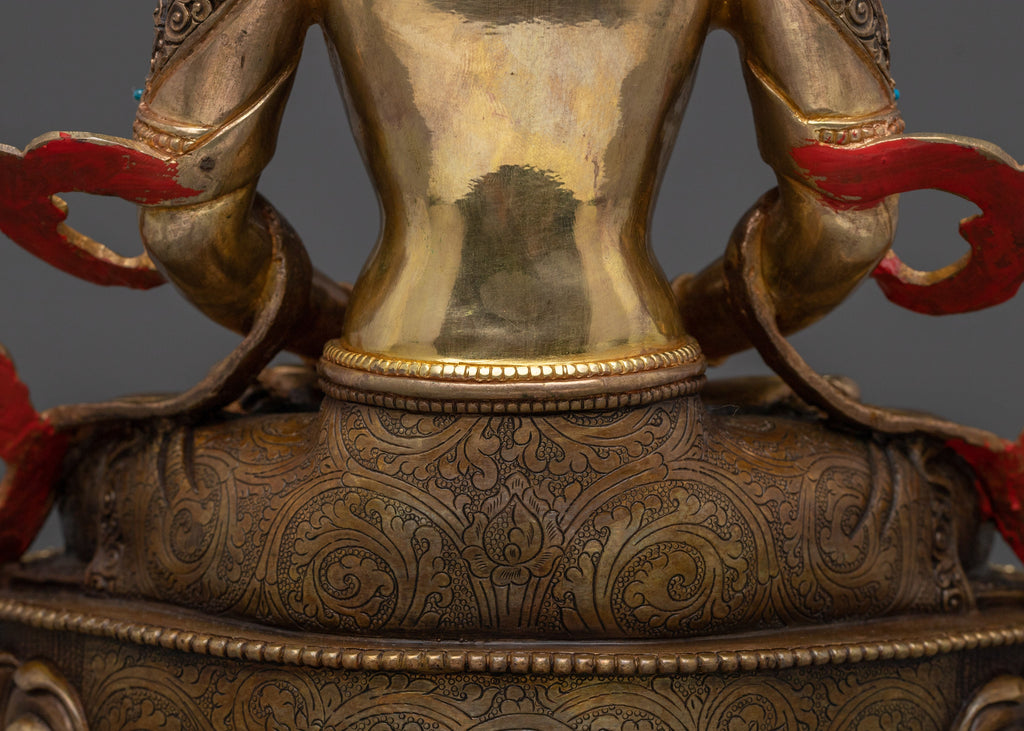 This Revered Buddhist Serene Amitayus Statue stands at 13”/33cm in height and 10.8”/27.5cm at the base, weighing 3.85 kg. Crafted from 24K Gold Gilded, Gold & Acrylic Paintings, a Copper Body, and adorned with gemstones, this elegant statue reflects the tranquil presence of Amitayus, the Buddha of Infinite Life. Handcrafted by skilled Nepali artisans, it serves as a meaningful symbol of longevity, healing, and spiritual abundance—perfect for altars, meditation spaces, or sacred home displays.