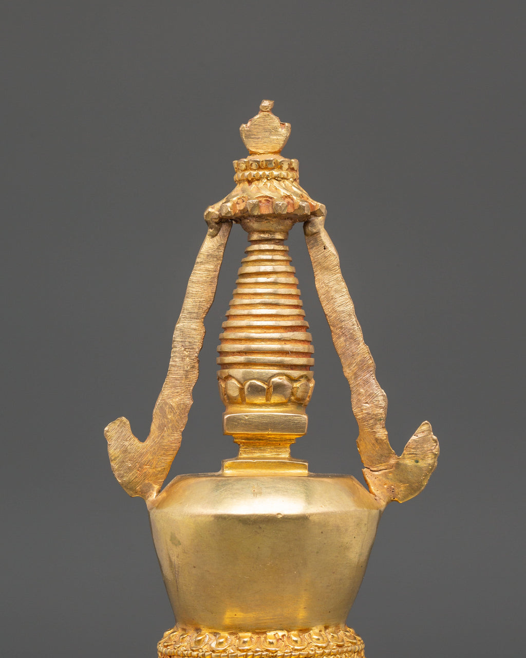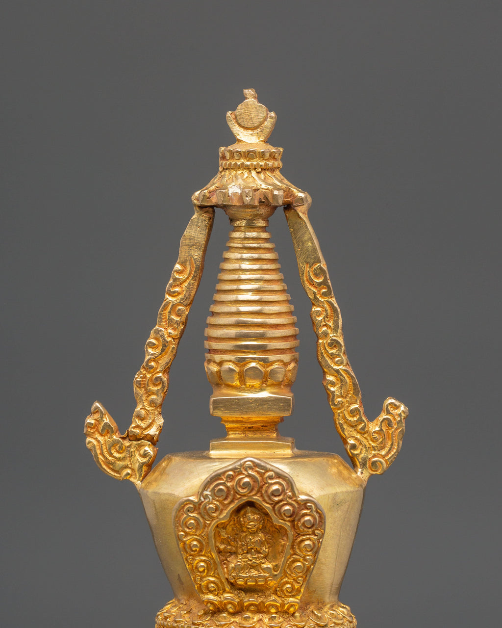 The Buddhist Shrine Stupa for Meditation stands as a sacred emblem of enlightenment and spiritual purity within Tibetan Buddhism. Measuring 24.5cm in height and 11.5cm in width, and crafted from copper with a radiant gold-plated finish, this stupa embodies the essence of the Buddha’s awakened mind. Traditionally, stupas are placed on altars to represent the path to enlightenment and serve as focal points for meditation, concentration, and offerings.