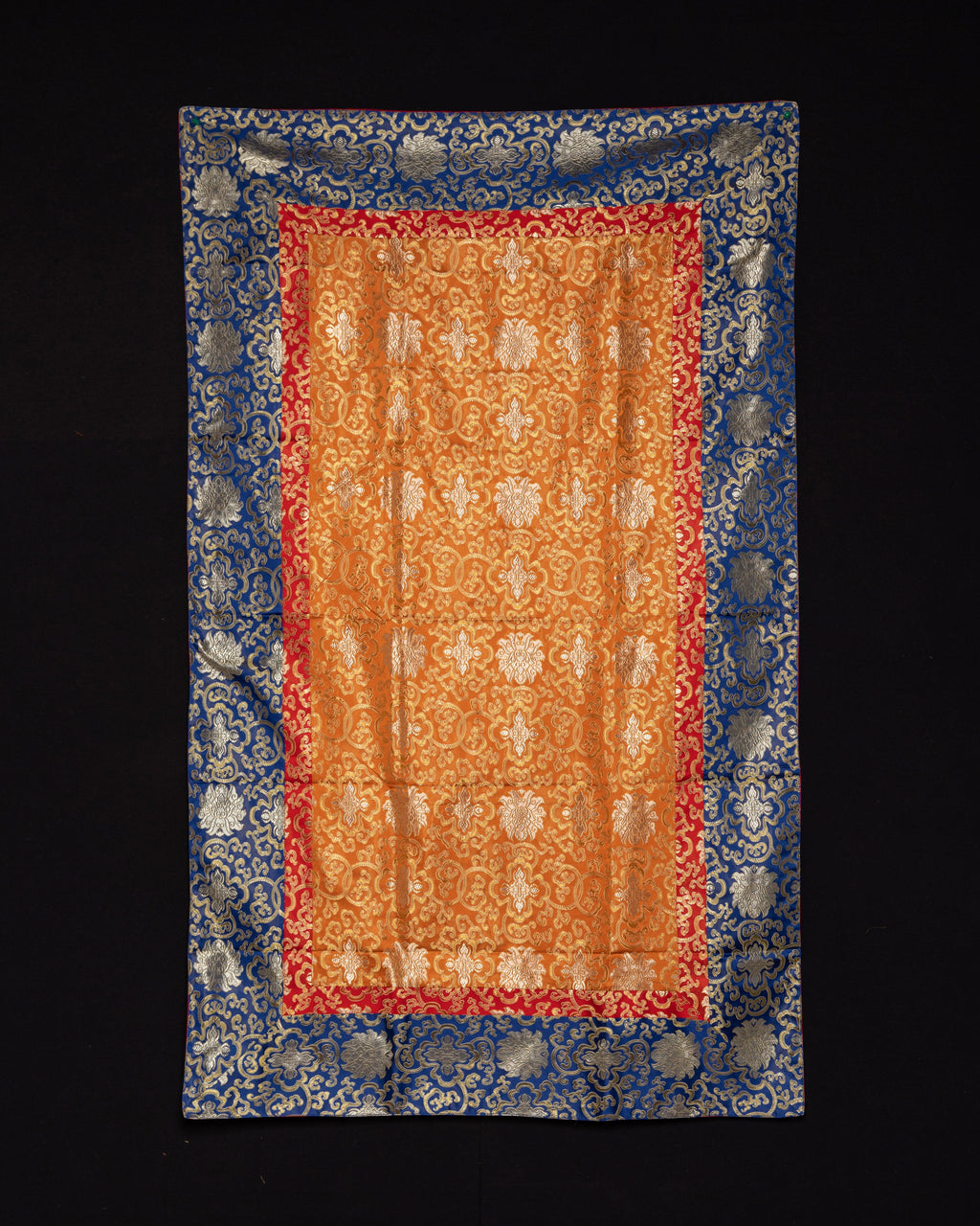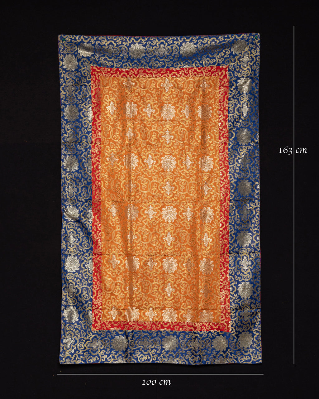 The material is embellished with exquisite Tibetan motifs in tones of red, blue, and gold, as well as silver patterns that capture the essence of Tibetan Buddhist art. The floral arrangements in the center reflect purity and spiritual growth, while the bordered patterns resemble auspicious symbols that invoke protection and blessings. These themes have essential implications in Buddhist tradition, representing harmony, serenity, and enlightenment. The sumptuous silk fabric highlights the exquisite designs, making this tablecloth an elegant complement to any religious area.