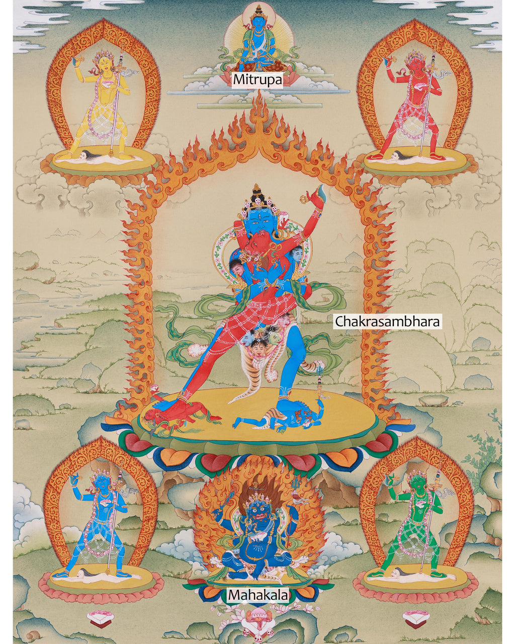 This thangka vividly portrays Chakrasamvara in his formidable, multi-armed form, engaged in the sacred dance of bliss and wisdom. His physique is embellished with elaborate 24K gold jewelry and robes, signifying his regal and divine status. His posture and aura embody strength and transformation, underscoring his role as the deity of ultimate empowerment. Above him, Mitrupa is depicted, further emphasizing his connection to the distinguished lineage of great tantric masters. Mahakala, the protector deity, is also included, symbolizing the capacity to eliminate obstacles on the path to enlightenment. Encircling Chakrasamvara are numerous yoginis, representing the feminine aspect of wisdom and transformation. The flames encircling Chakrasamvara, along with the gentle background of clouds and mountains, amplify his dynamic power while offering a serene setting that reflects the spiritual essence of the practice.