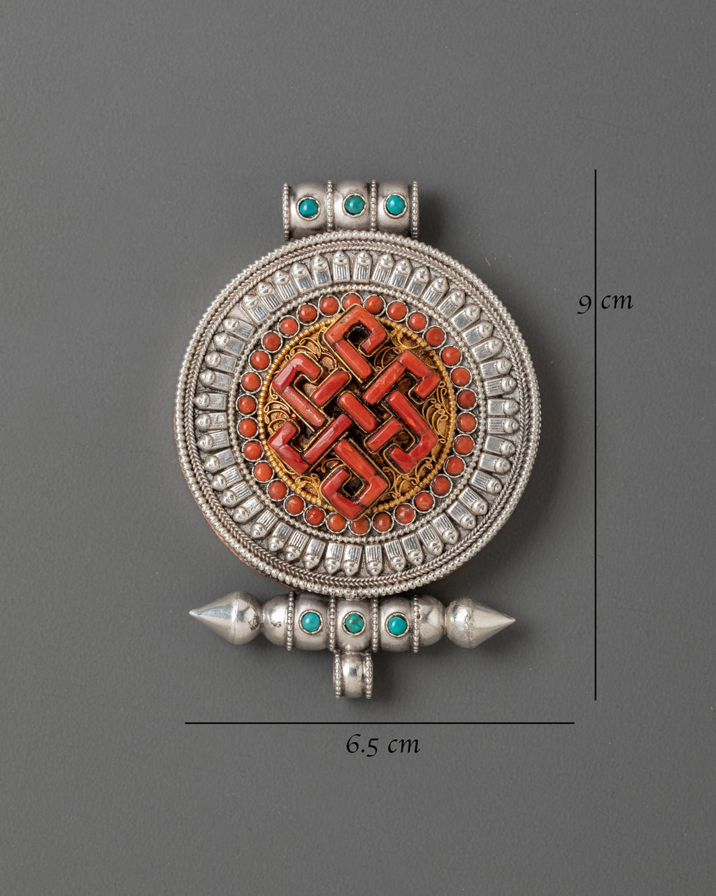 The Buddhist Tibetan Ghau Box Locket is an exquisite and sacred pendant intended to hold spiritual treasures, mantras, or prayers. This locket, measuring 9cm in height and 6.5cm in width, is crafted from silver and incorporates semi-precious Coral and Turquoise stones, which represent healing, protection, and spiritual calm. The locket's principal design is the Endless Knot, a Tibetan Buddhist symbol that represents the connectivity of wisdom, compassion, and the unending flow of life. This locket is not just a decoration, but it also provides psychic protection and channels divine benefits.