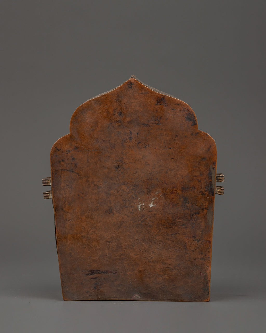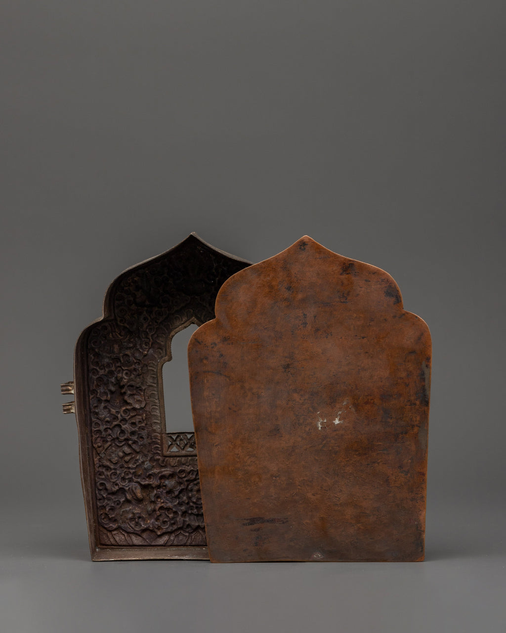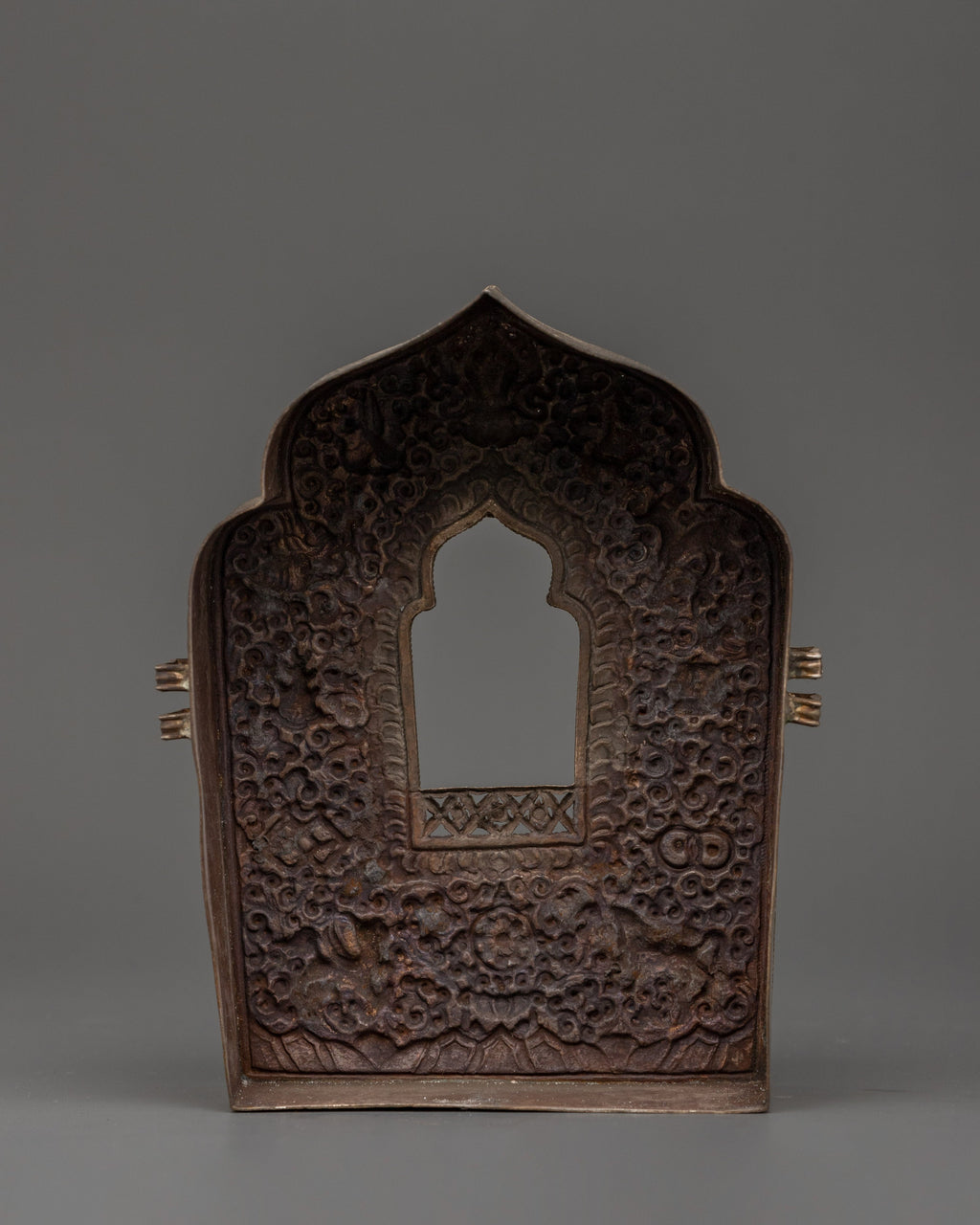 The carvings on this Ghau Box depict a variety of auspicious symbols of great spiritual significance in Buddhist tradition, including the unending knot, the dharma wheel, and the lotus flower. Each symbol contributes to creating a sense of spiritual harmony, wealth, and protection. The craftsmanship of this box exemplifies Tibetan creativity, resulting in not just a beautiful object but also a sacred artifact that can be used in spiritual rituals or meditation.
