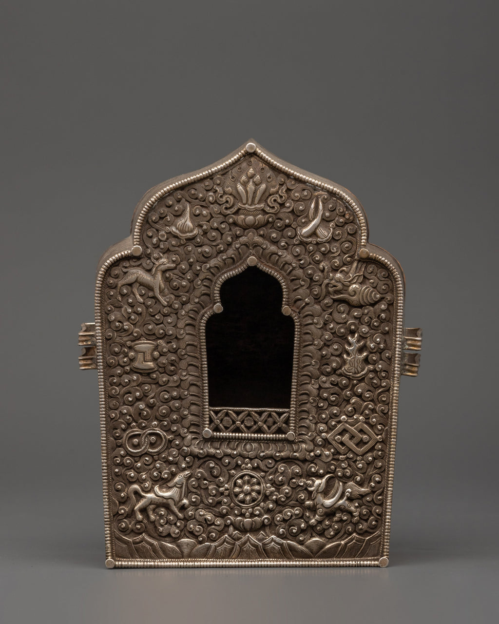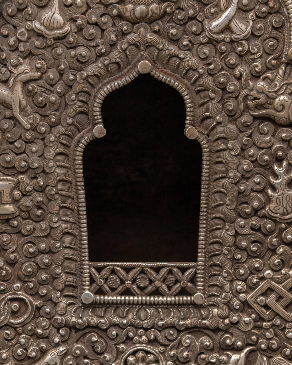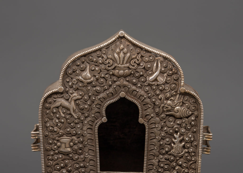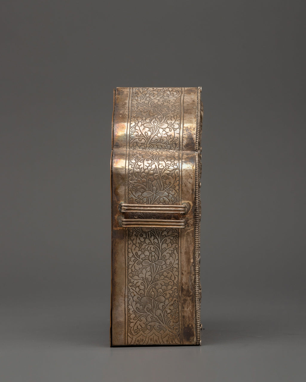 With its intricate decorations and pure silver craftsmanship, this Ghau Box is not just a beautiful item. It is a sacred Tibetan treasure rich with symbolic meaning for practitioners and collectors. The antique finish lends it a distinct historical feel, while the auspicious symbols embody the harmony and serenity central to Tibetan Buddhist doctrine. This Ghau Box is perfect for altars, meditation spaces, or as a memorable gift. It connects deeply to Tibetan spiritual practices. Each symbol contributes to spiritual harmony, abundance, and protection. The craftsmanship of this box showcases Tibetan creativity, resulting in a stunning object and a sacred artifact that can be used in spiritual rituals or meditation.