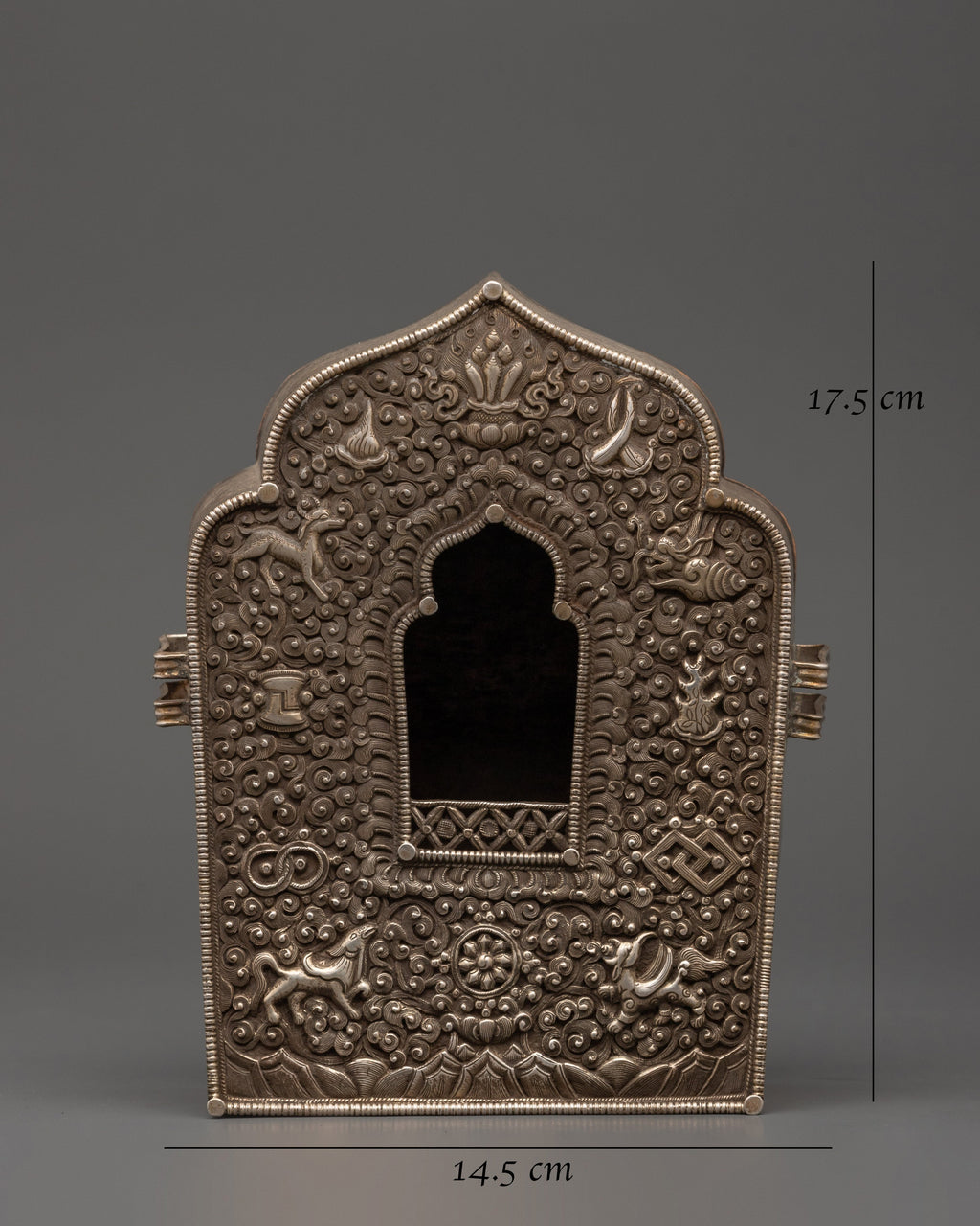 This Ghau Box is a stunning example of Tibetan craftsmanship, made of pure silver with intricate auspicious symbols engraved on its surface. Measuring 17.5cm in height and 14.5cm in width, this finely crafted box weighs 0.42kg and has a sturdy yet lightweight feel. Its antique finish enhances its timeless appeal, making it an excellent addition to any spiritual collection or a thoughtful gift box. The auspicious symbols are carefully carved and represent important aspects of Tibetan Buddhism, adding depth and significance to the item.