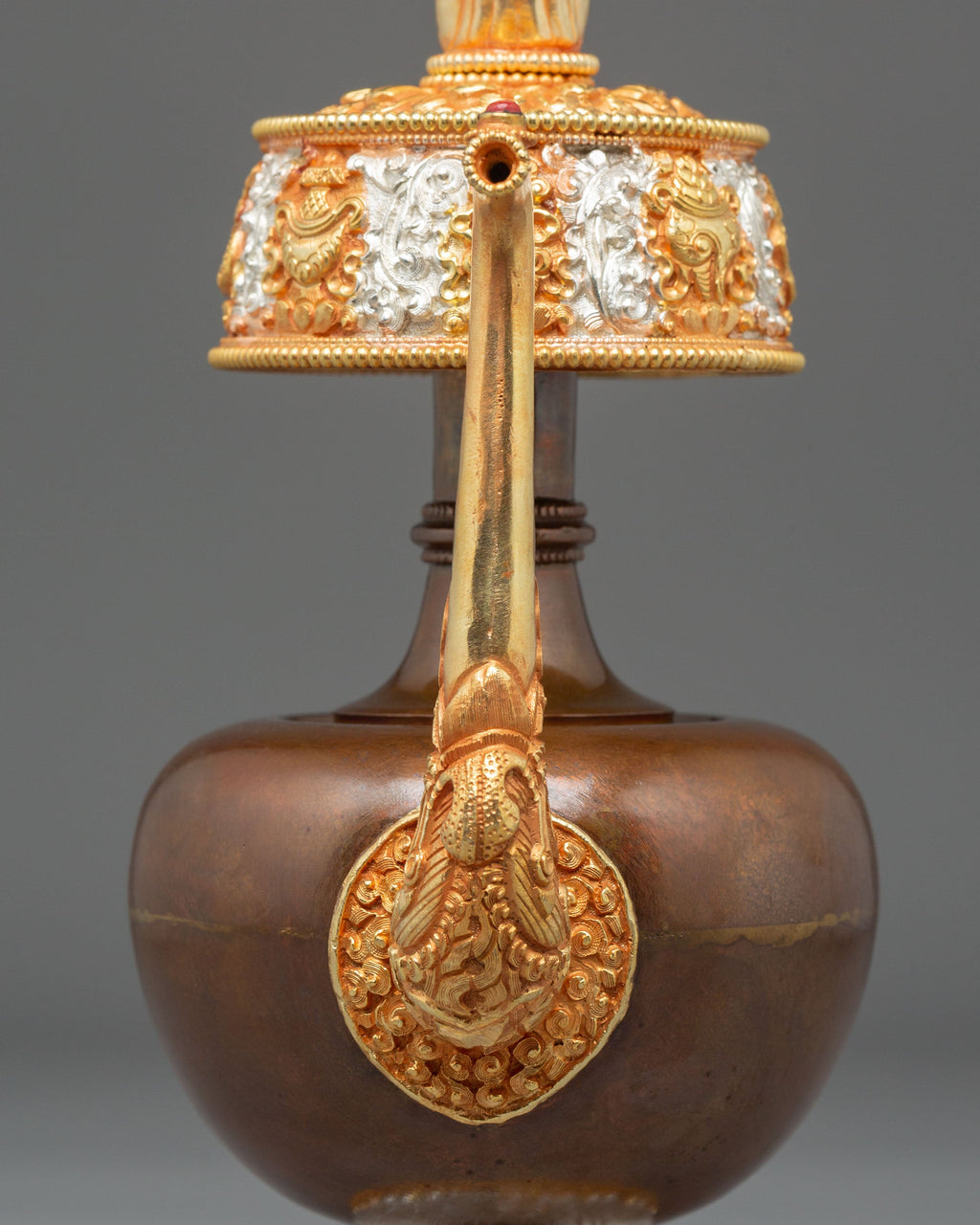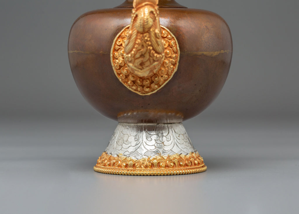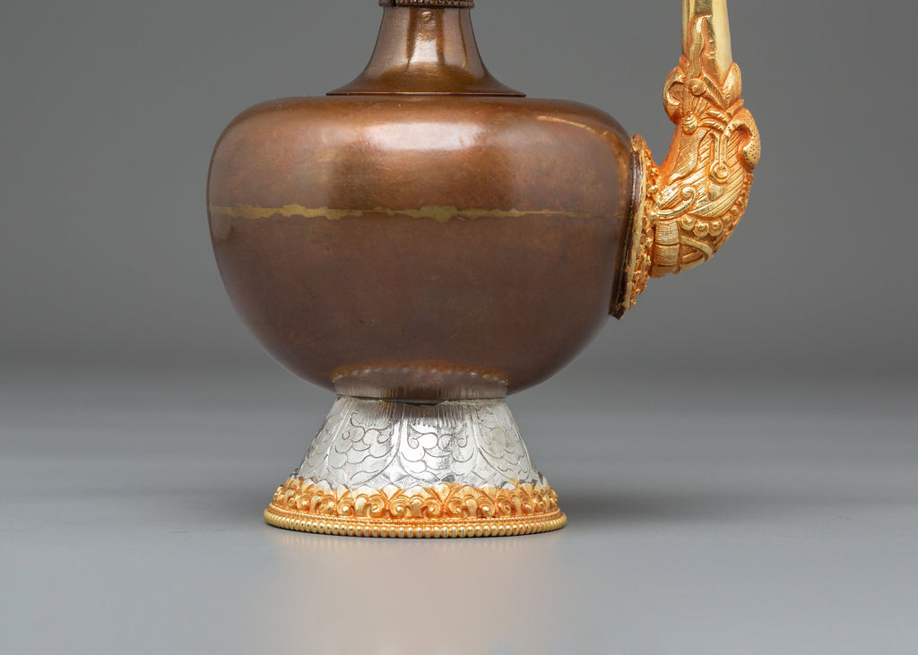 Each Buddhist Water Offering Bhumba is meticulously handcrafted from oxidized copper, adorned with gold and silver plating, reflecting the fusion of spiritual and artistic mastery. The design follows the ancient Himalayan craftsmanship tradition, featuring fine detailing that embodies devotion and ritual purity. Measuring 29cm in height and 14cm in width, the set’s balanced proportions enhance its aesthetic and ceremonial presence. This Buddhist Water Offering Bhumba Set is ideal for meditation, offerings, and ceremonial practices. Whether displayed as a sacred décor piece or used during spiritual rituals, it embodies enlightenment, compassion, and the power of purification. Let this Tibetan Buddhist Water Offering Bhumba Set elevate your altar, inspiring mindfulness and devotion in every sacred moment.