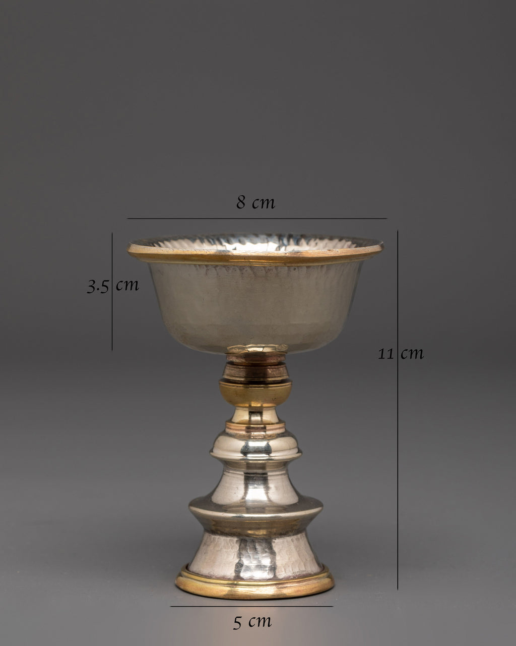 Crafted from copper and silver plating, this butter lamp has a weight of 0.16kg, making it a lightweight yet elegant addition to your decor. With an inner depth of 3.5cm and a base of 5cm, it is ideal for small offerings or creating a calming atmosphere during meditation. Whether placed on your altar or used during spiritual ceremonies, this lamp brings warmth, light, and a sense of sacredness to your environment, helping foster tranquility and enlightenment in your home.