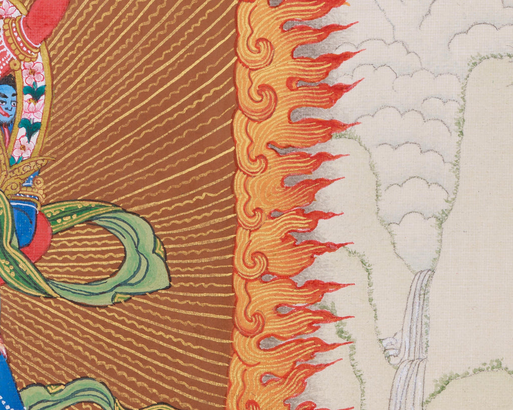 This thangka depicts Chakrasamvara in Yab-Yum with Vajravarahi, illustrating the unity of method and wisdom. His blue form represents compassion and boundless infinity. He holds a vajra and a bell, symbols of skillful means and wisdom. Vajravarahi is depicted with a curved knife and a skull cup, symbolizing the cutting of ignorance and the transformation of suffering. Adorned with a five-skull crown and encircled by flames, he stands on a lotus and sun disc, symbolizing victory over illusion and awakening. The use of golden highlights and intricate lines reflects deep spiritual meaning and artistic craftsmanship. Invite this thangka into your space to foster balance, clarity, and enlightenment.