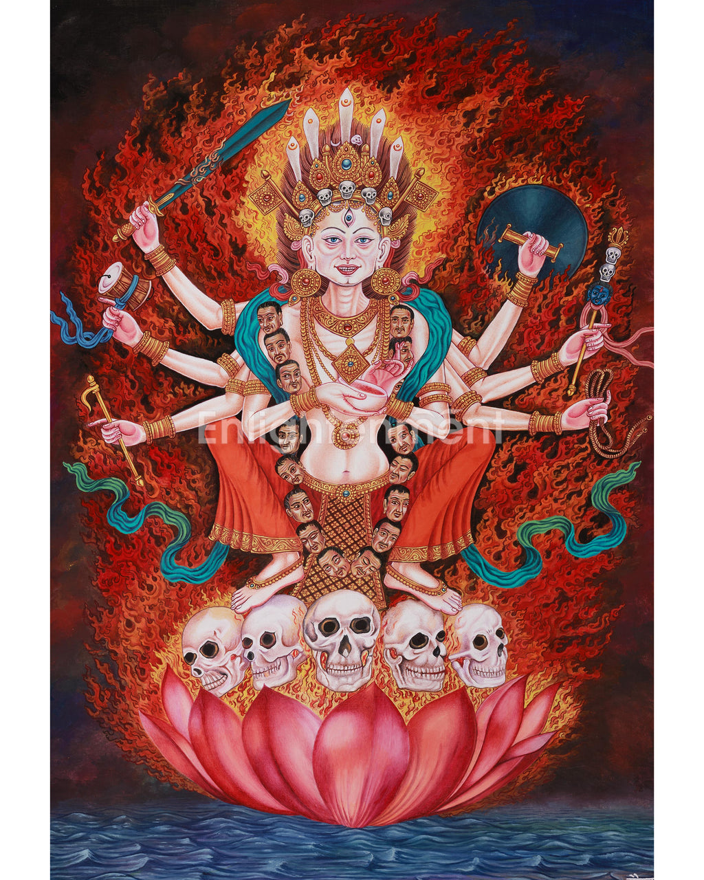 Her final left hand is positioned in the Bindu Mudra, a gesture symbolizing sacrifice that embodies the spiritual blood offerings essential for transformation and liberation from suffering. This potent mudra, paired with the weapons she carries, showcases her dual essence: simultaneously destructive and protective, leading practitioners on their spiritual path through profound purification. Chamunda's halo is a brilliant fiery background, symbolizing her fury and the immense strength needed to cleanse and transform the mind. She wears a garland of severed heads, representing her dominion over both life and death, as well as the samsara cycle of birth, death, and reincarnation.