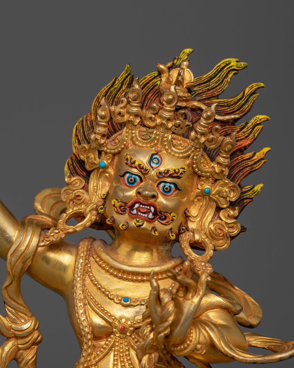 This Vajrapani statue represents the fierce protector of the Dharma. He holds a vajra in his right hand, symbolizing indestructible spiritual power, while his left hand grips a lasso to bind and overcome harmful forces. A blazing, flaming halo surrounds him, embodying his wrathful energy that eradicates obstacles and ignorance. Positioned in alidhasana (trampling posture), he stands triumphantly over negativity with unyielding force. Vajrapani wears a five-skull crown, signifying the transformation of the five poisons into wisdom, and a serpent-like garland drapes around his body. His lower garment, made of tiger skin, symbolizes his fearlessness and mastery over primal energy. His forehead bears a third eye, representing awakened insight, and he is seated upon a sun disc lotus, radiating enlightenment and power.