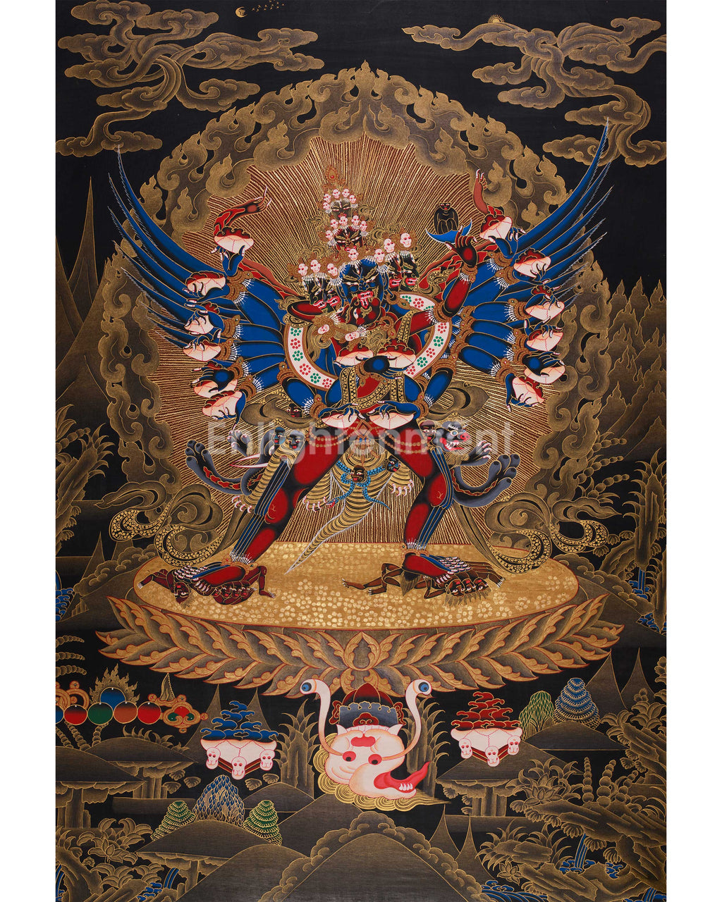 Chemchok Heruka, with his multiple arms and faces, represents the dynamic force needed to eradicate ignorance and cleanse ingrained negativities. Instead of evoking fear, his furious visage and fiery aura serve to awaken consciousness by piercing ego and illusion. He is depicted in this striking illustration as being united with his partner, which serves as a symbolic representation of the union of insight and compassion, or knowledge and method, ultimately leading to realization. The central figure is encircled by roaring flames of transformation, painted in brilliant reds and oranges, and adorned with lavishly detailed red and gold robes. With glowing halos, sacred decorations, and the golden lotus pedestal highlighting his enlightened state, the use of 24K gold emphasizes his heavenly nature. The symbolic implements held in each hand—skull cups and ritual blades—represent the means of change used to cut off ignorance and attachment.