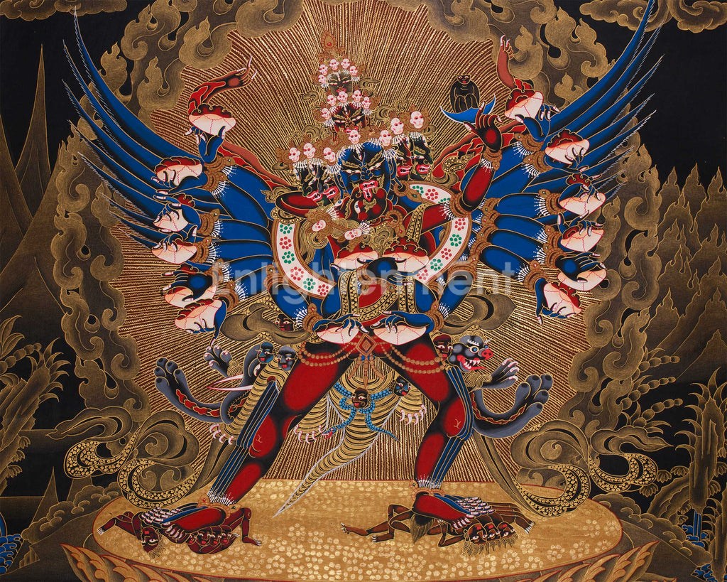 This fierce and transformational Chemchok Heruka with Consort thangka depicts one of Tibetan Buddhism's most powerful wrathful deities. Using rich acrylic colors, this thangka is painstakingly hand-painted on high-quality cotton canvas, producing a striking and long-lasting representation of the deities. Genuine 24K gold is used to enrich the artwork, highlighting key elements such as the lotus petals, halo, and other religious symbols, lending the composition a brilliant, divine touch. A talented artist creates the thangka traditionally, guaranteeing a genuine and comprehensive portrayal that embodies the piece's complex artistic and spiritual meaning. It is a priceless addition to any collection or area devoted to spiritual practice due to its overall outstanding quality.