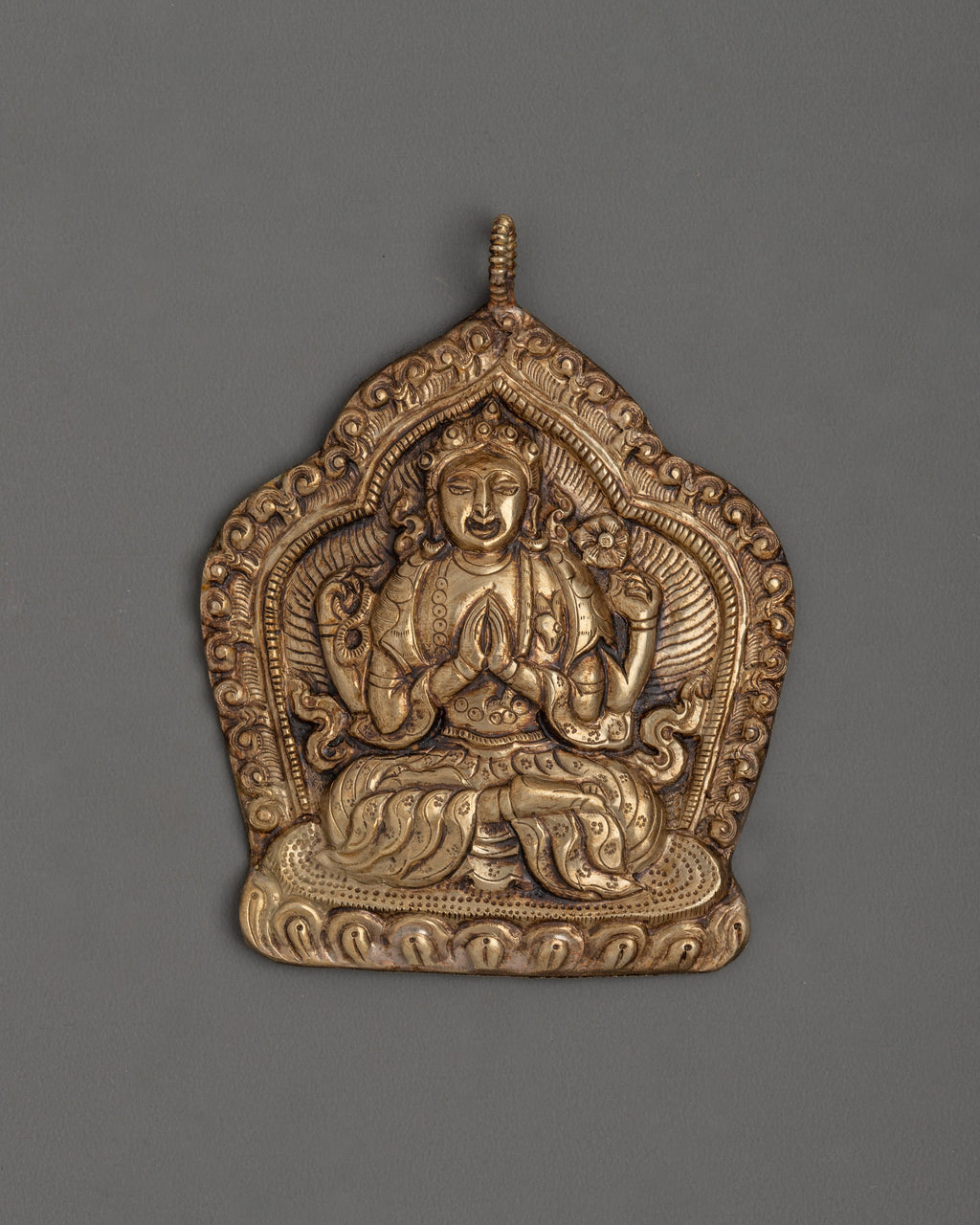 The Chenresig is a symbol of compassion, attracts beneficial energy and healing to your surroundings. Crafted with care, it represents the discipline of selflessness and the value of awareness. This white metal sculpture combines the elegance of traditional Tibetan Buddhist art with a modern twist, making it an excellent choice for people looking for spiritual decor with purpose. This Chenresig wall hanging is an ideal focal point for your altar, meditation room, or any other location that promotes peace and serenity.