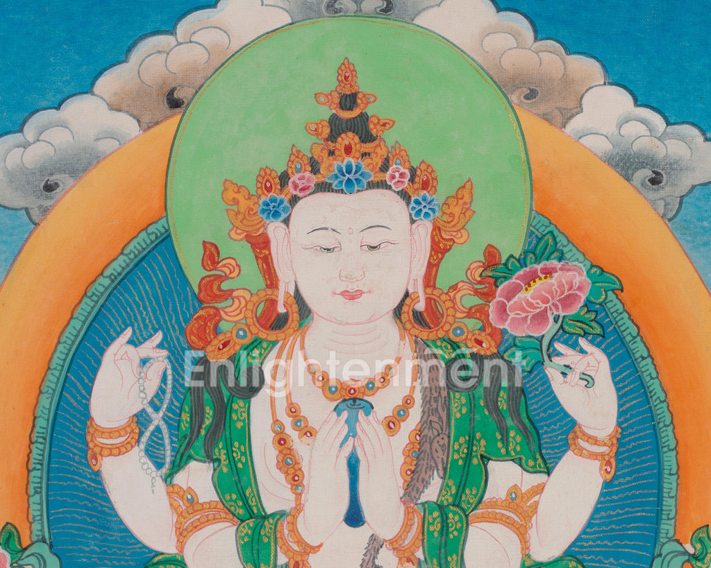 Chenrezig is depicted with four arms, symbolizing his capacity to reach out and aid all sentient beings. His two middle hands carry a wish-fulfilling jewel at his heart, symbolizing the power of compassion. In contrast, his other hands hold a crystal mala, indicating constant prayer, and a lotus flower, symbolizing purity and enlightenment. His peaceful appearance, flowing robes, and celestial halo all have bright details that perfectly convey the Bodhisattva's divine essence.