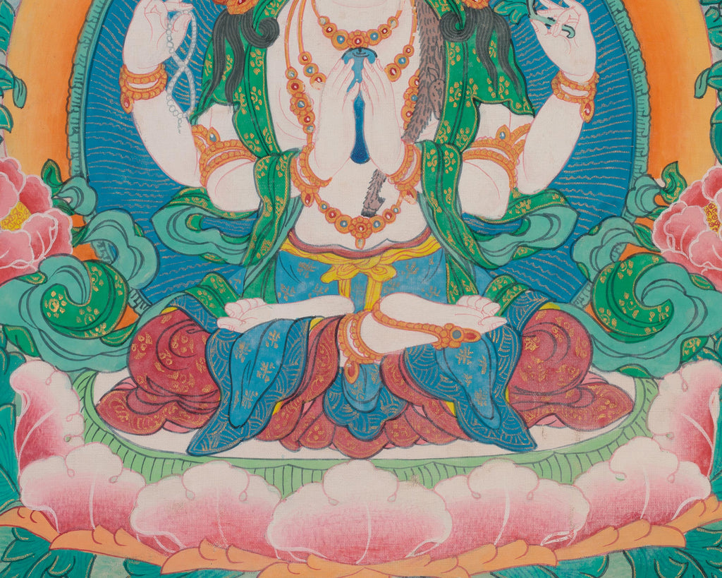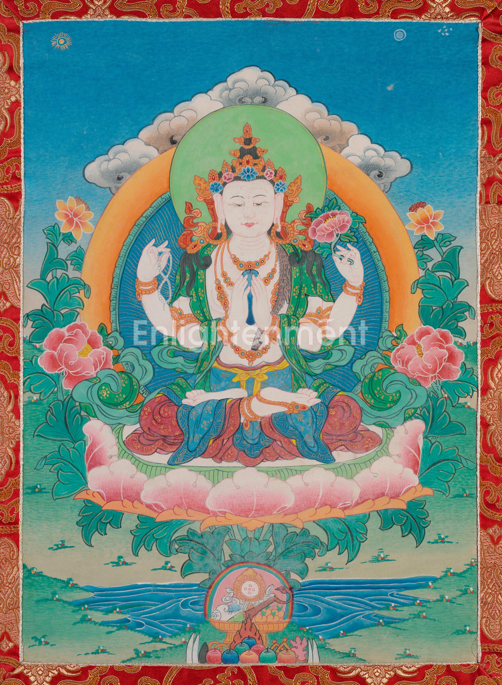 Brocade Mounted Thangka of 4 Armed Chenrezig Bodhisattva of Great Compassion