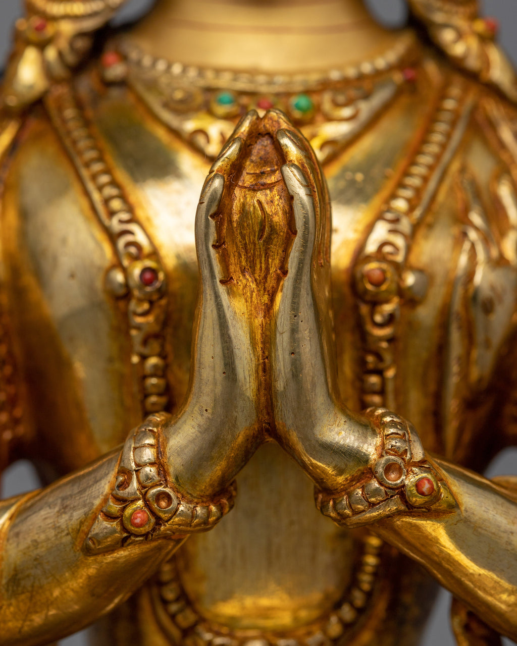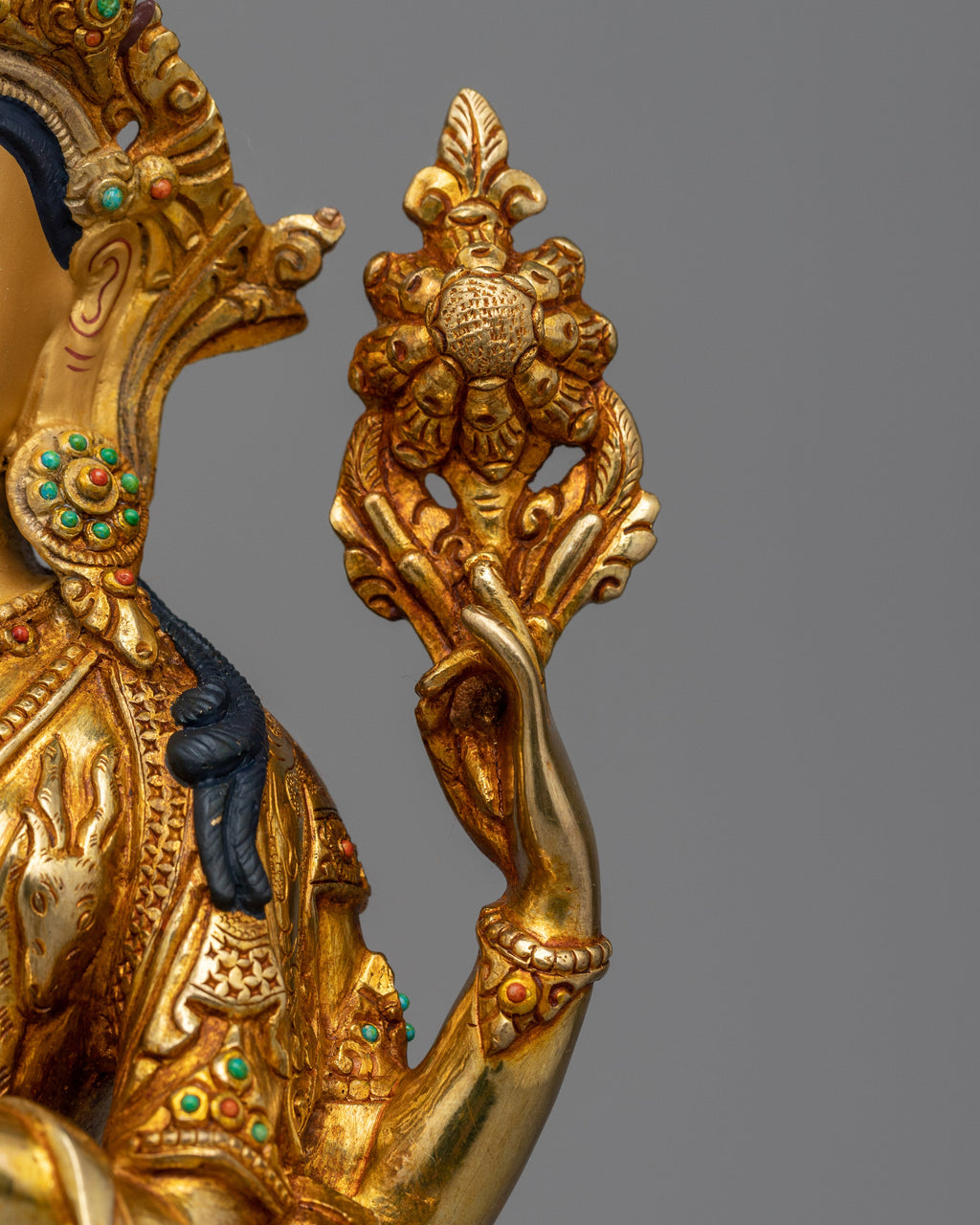 Presenting our amazing "Chenrezig Gold Gilded 25cm" statue, which is a depiction of the Lord of Compassion. Standing 9.8 inches tall and weighing 1.93 kg, this statue is made of solid copper and gilded with 24K gold. The gold and acrylic paints, mixed with hand-carved jewels, show the fine details of Chenrezig's tranquil look, elegant posture, and the symbolic objects he holds, which represent profound compassion and serenity.