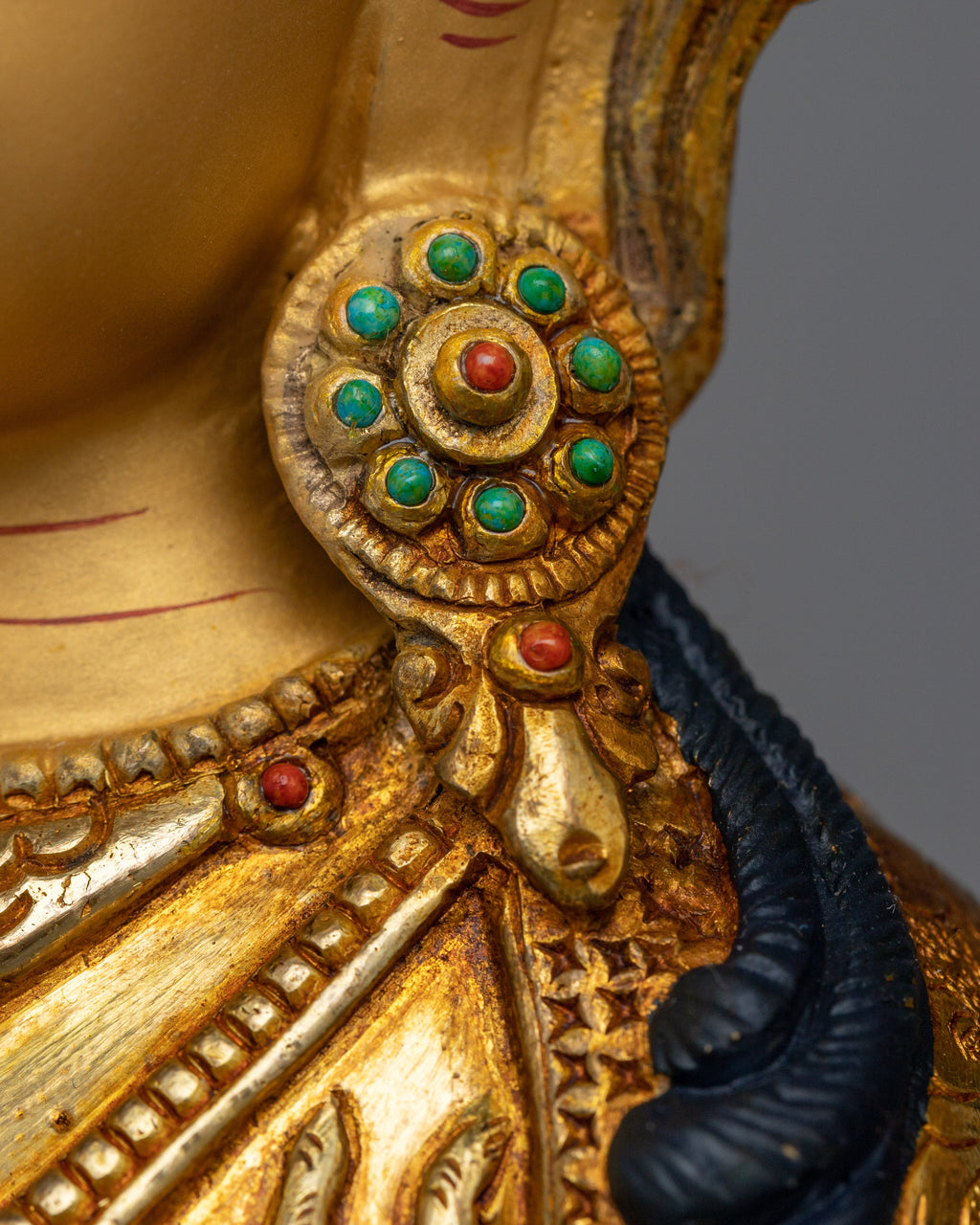 Chenrezig (Avalokiteshvara) is a central figure in Mahayana Buddhism, revered for his compassion. He is often depicted with multiple arms, each representing a facet of his loving kindness and his readiness to provide help. His mantra, Om Mani Padme Hum, is one of the most widely recited in Buddhism, embodying the essence of the Bodhisattva’s promise to aid all beings.