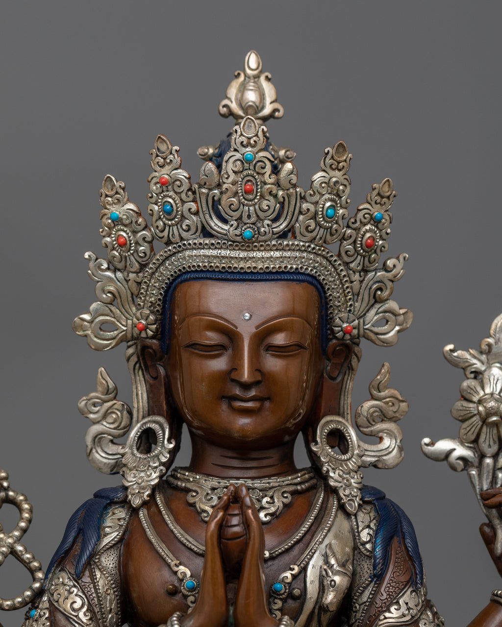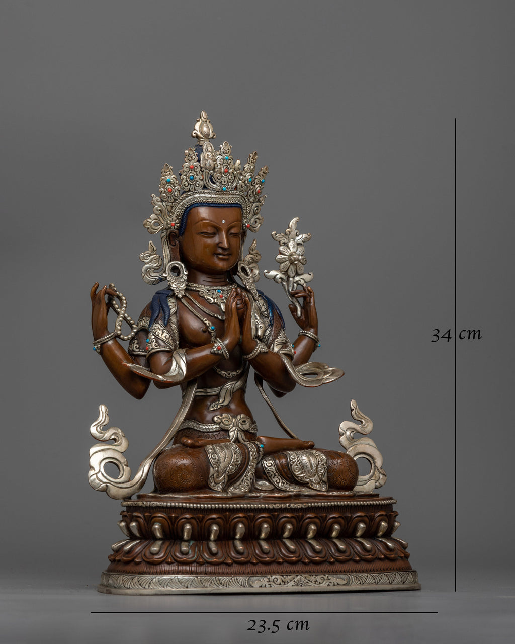 This solid 4.04-kilogram statue will ground your spiritual practice and give your room a sense of permanence. The harmonic combination of oxidized copper and silver represents the enduring character of Chenrezig's protection and compassion, elevating it above simple decoration to the status of a meaningful spiritual ally. This statue will inspire and strengthen your connection to the teachings and benefits of Chenrezig, making it perfect for spiritual practitioners, meditation enthusiasts, and cultural aficionados.