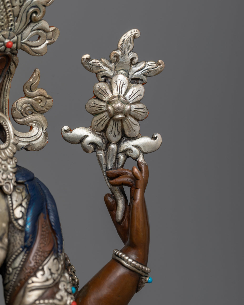 Enhance your surroundings with this gorgeous Chenrezig Silver Plated Oxidized-34cm Statue, which demonstrates the great craftsmanship of Patan's talented artisans. This statue has a body composed of oxidized copper and is lovingly embellished with gemstones and silver plating. From the calm expression on Chenrezig's face to the elaborate patterns on his clothing, every element exhibits exceptional skill and craftsmanship.