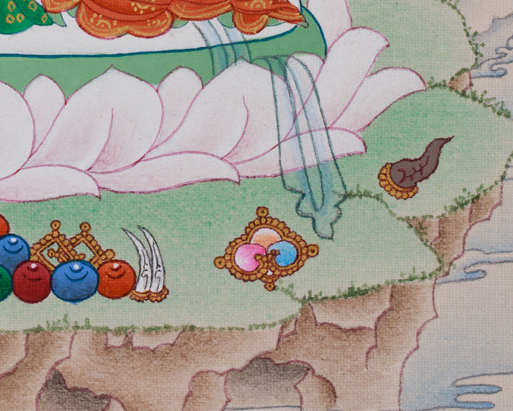 Chenrezig, also known as Avalokiteshvara, is a highly revered bodhisattva in Tibetan Buddhism, embodying universal compassion. It is believed that all Buddhas manifest through him to alleviate the suffering of sentient beings. In this thangka, Chenrezig is depicted with four arms, illustrating his limitless capacity to assist beings in all directions. His upper hands hold a lotus flower and a crystal mala—symbols of purity and boundless compassion—while his lower hands are joined in prayer at his heart, emanating love and serenity. He is seated on a vibrant lotus throne, surrounded by blooming lotuses and soft shades of green and orange, symbolizing enlightenment emerging from illusion. This Chenrezig painting embodies love and mindfulness, making it an ideal meditation aid or spiritual focal point for the home.